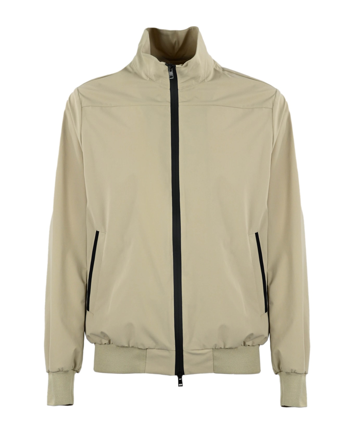 technical fabric jacket: polo neck zip closure front pockets with zip logo patch on the sleeve composition: 88% polyamide, 12% elastane