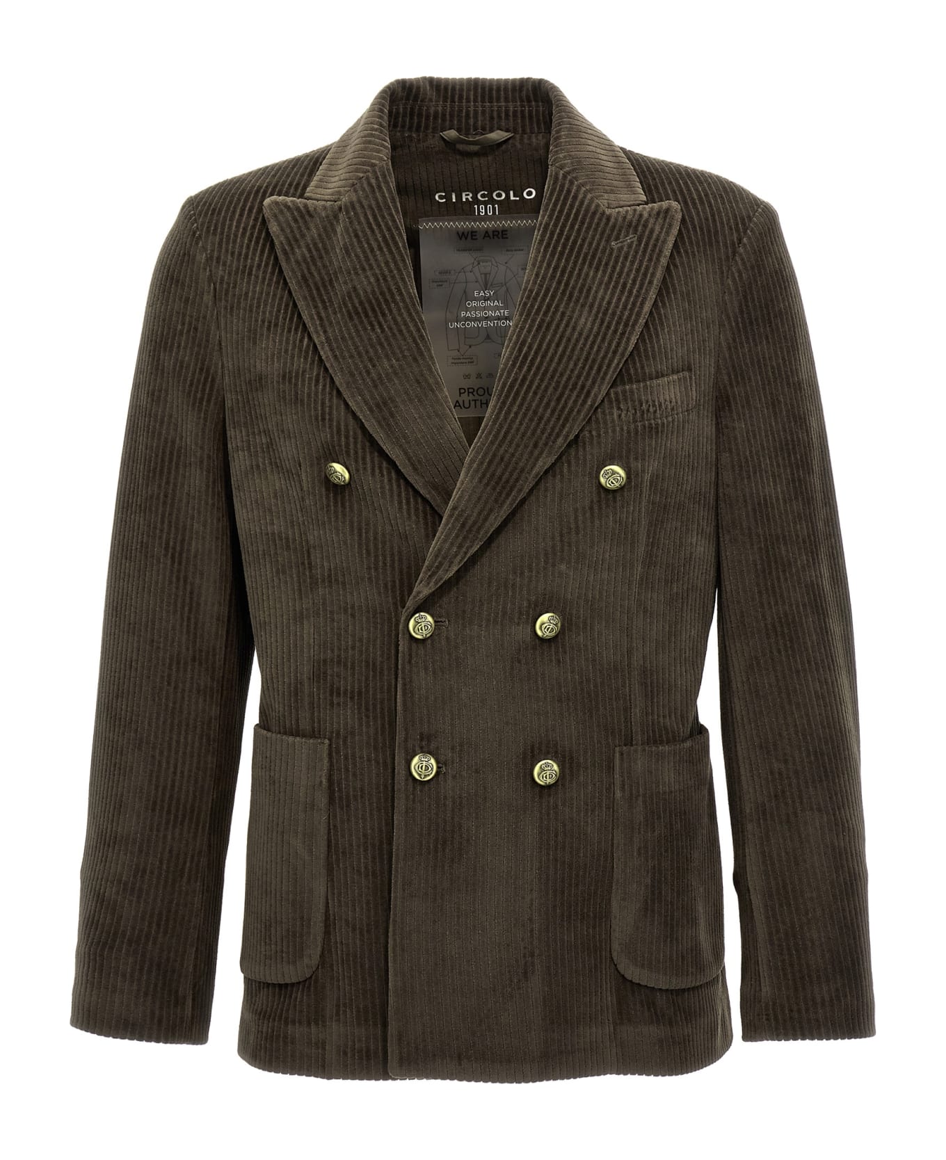 Double-breasted corduroy blazer with button closure, pockets, long sleeves, back vents.