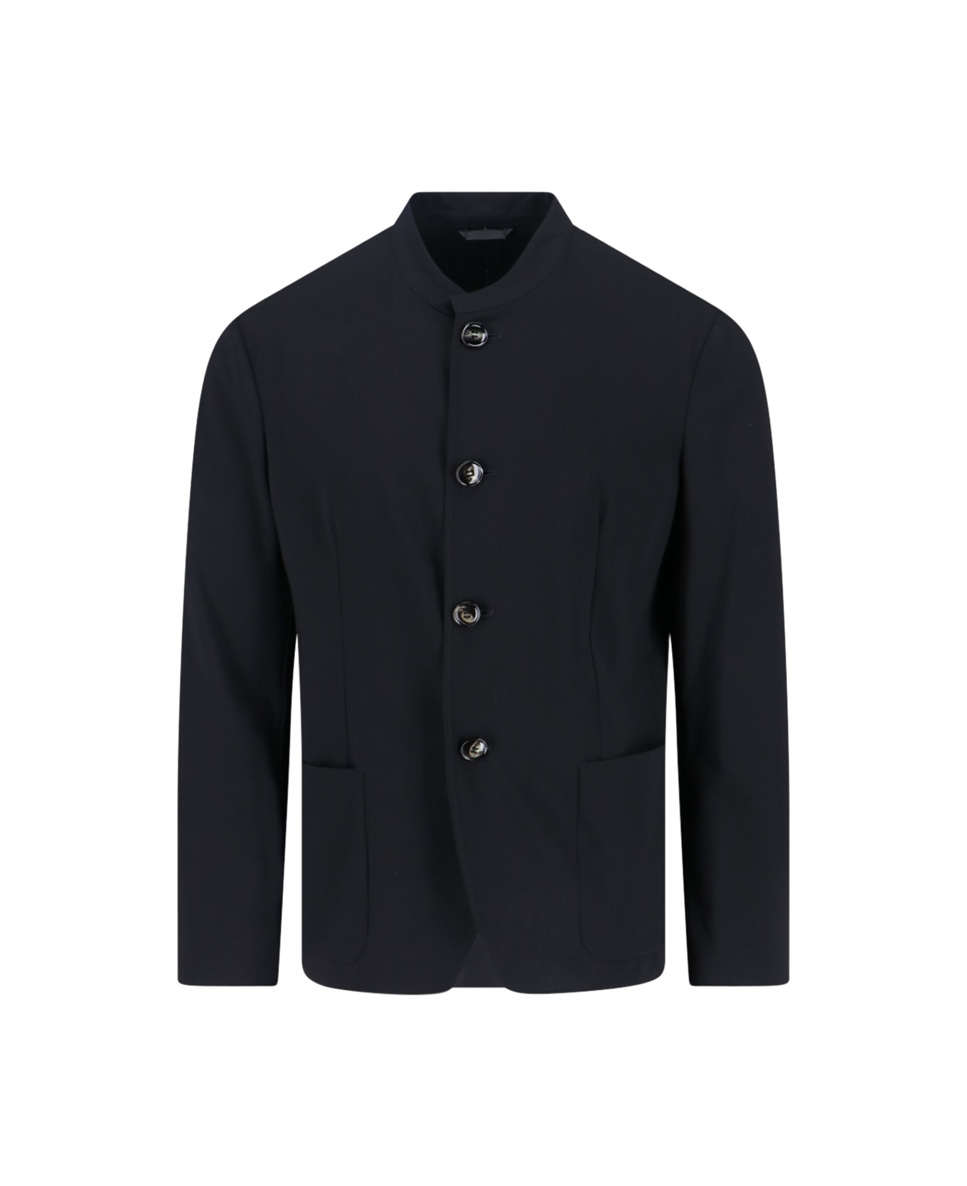 Black virgin wool blazer with mandarin collar, front button closure, long sleeves, two front pockets, straight hem.
