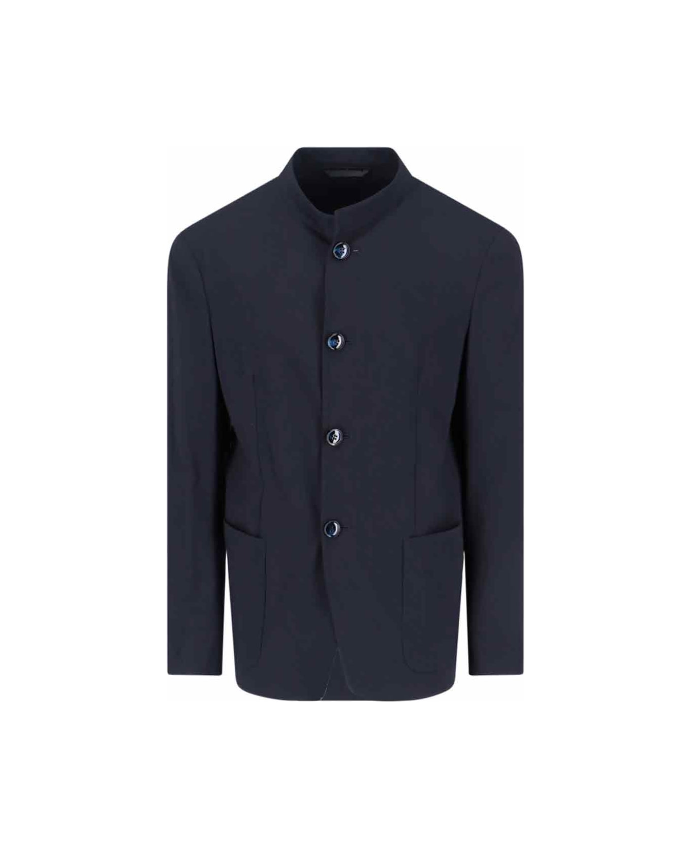Giorgio Armani dark blue virgin wool blazer with mandarin collar, front button closure, long sleeves, two front pockets, straight hem. Composition: 100% Virgin Wool