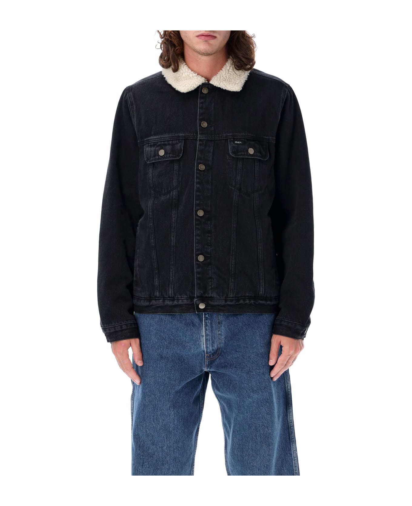 Waylon Denim Trucker Jacket By Rvca. Featuring: Collar Neck Regular Fit. Long Sleeve. Rvca Metal Shank Closure Flap Pockets At Chest Welt Pockets At Front Inner Welt Pockets Label At Wearers Left Pocket Flap Polyester Sherpa Collar Matching Cuff Adjustable Tab At Waist Model Is 1,90 M Tall And He Is Wearing Size L
