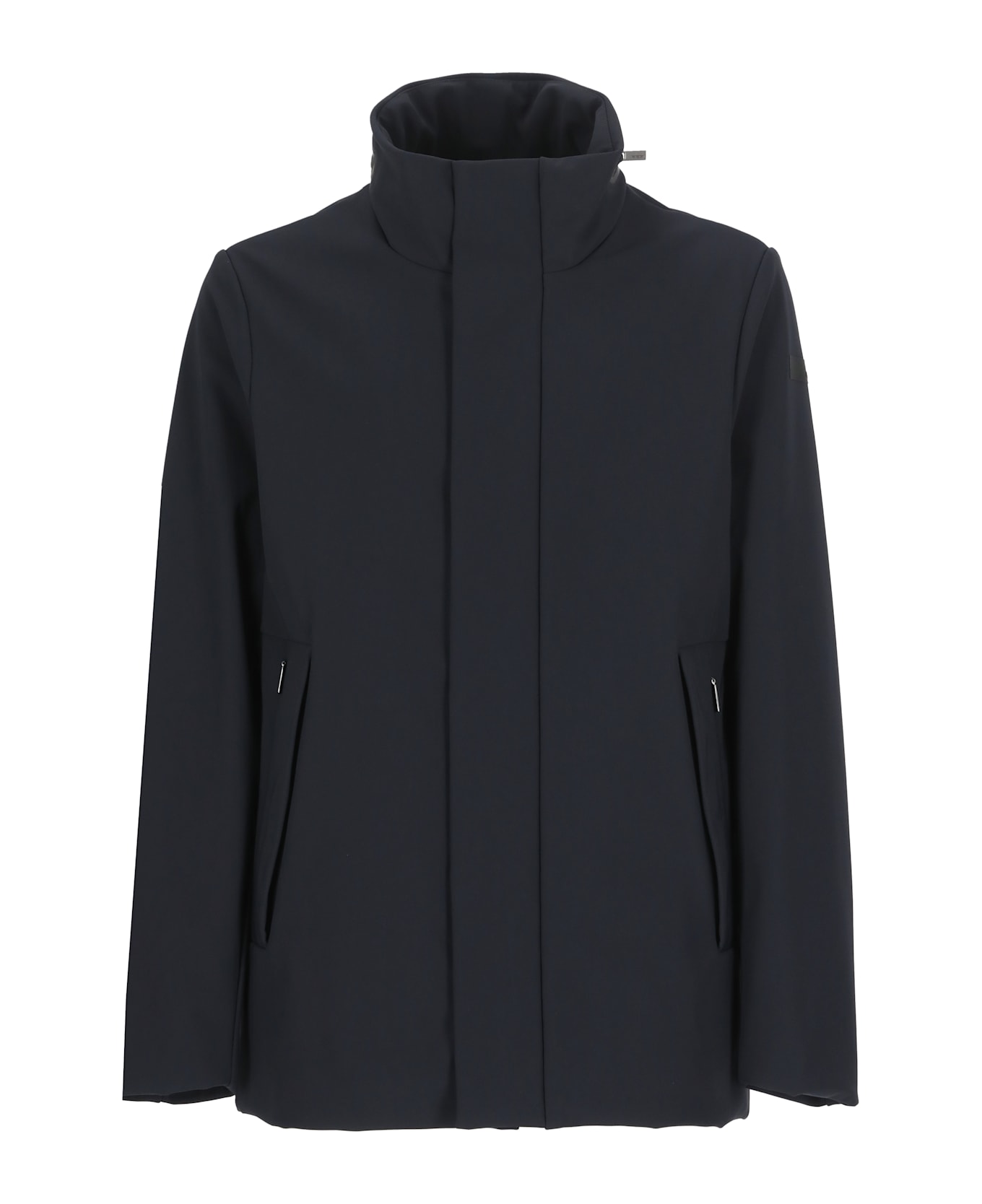- Blue RRD Roberto Ricci Design padded jacket for man - High neck - Long sleeves with logoed patch at left sleeve - Front zip and button fastening - Two front zip pockets Composition: 79% Polyamide, 21% Elastane Filling:, 90% Goose Down, 10% Goose Feather