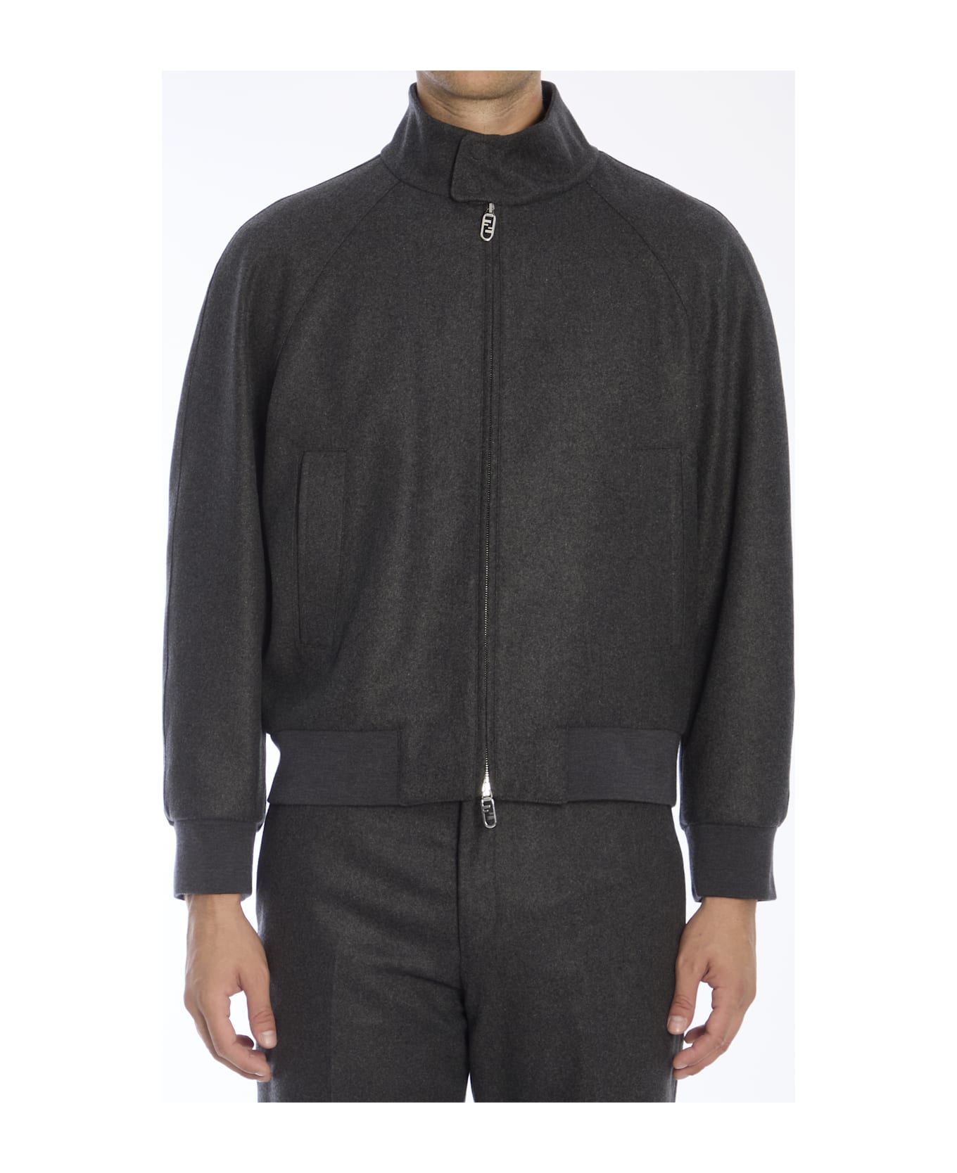 Bomber jacket in grey cashmere with embossed tonal FF patch embroidered at the back of the neck. It features high neck with press-studs, front Fendi O'Lock two-way zip closure, two side welt pockets and rib-knit trims on cuffs and hem. Regular fit.