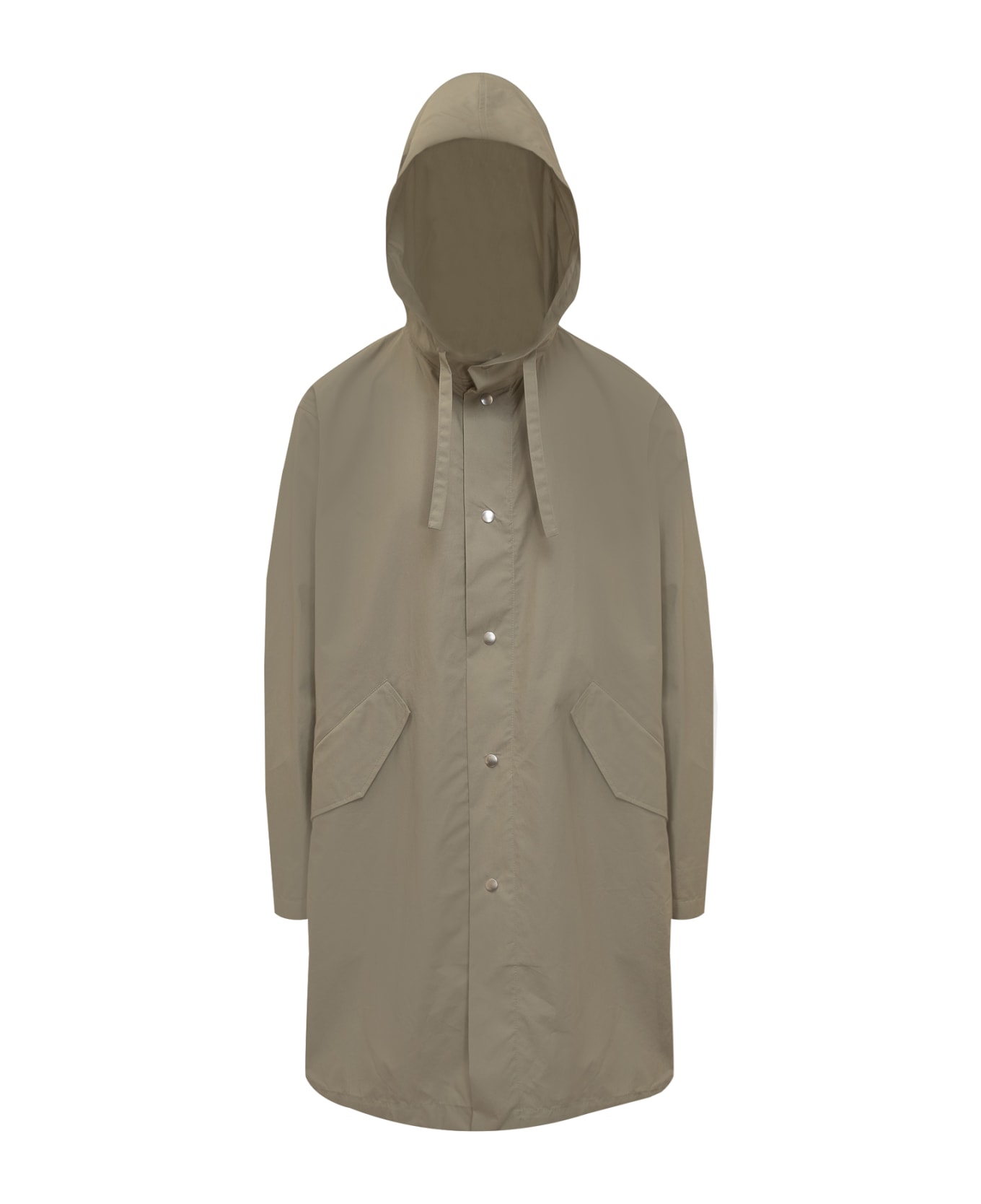 Long trench coat. Hooded parka. Drawstring hood. Button closure. Two side pockets. Logo printed on the back.