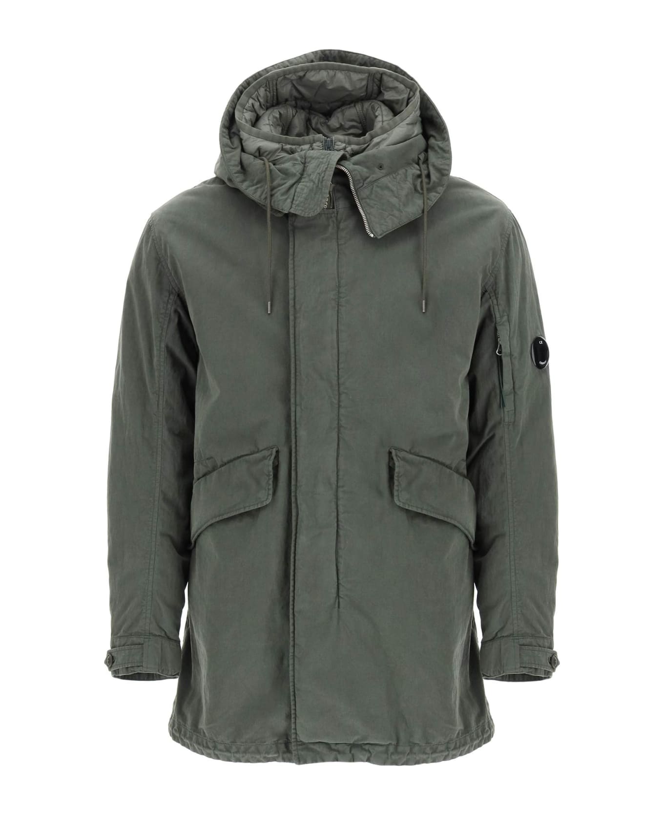 C. P. Company parka crafted in garment-dyed 50 Fili fabric with polyurethane coating. Double-way zip closure hidden by flap with press-studs, drawstring hood, side welt pockets with flap, adjustable cuffs, zipper welt pocket with the iconic Lens insert on the left sleeve. Straight-cut regular fit with adjustable waist and hem. Equipped with a detachable lining in slightly padded quilted nylon with zip closure and hood. The model is 187 cm tall and wears a size 48.