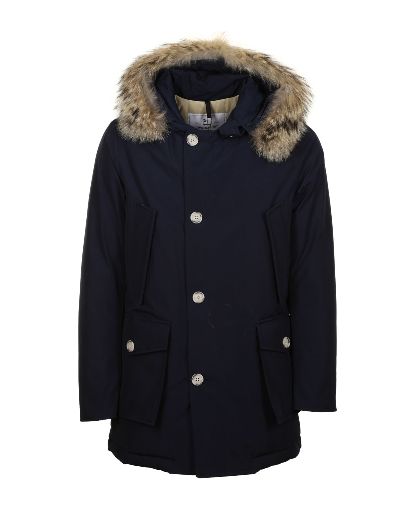 Woolrich Arctic Parka blue, made of water-repellent fabric, resistant to snow, rain and wind, regular fit, collar with hood and removable fur insert, closure with zip covered by flap and buttons, chest handwarmer pockets with flap, front pockets with flap and button, logo embroidered at the neck, 80/20 down padding.