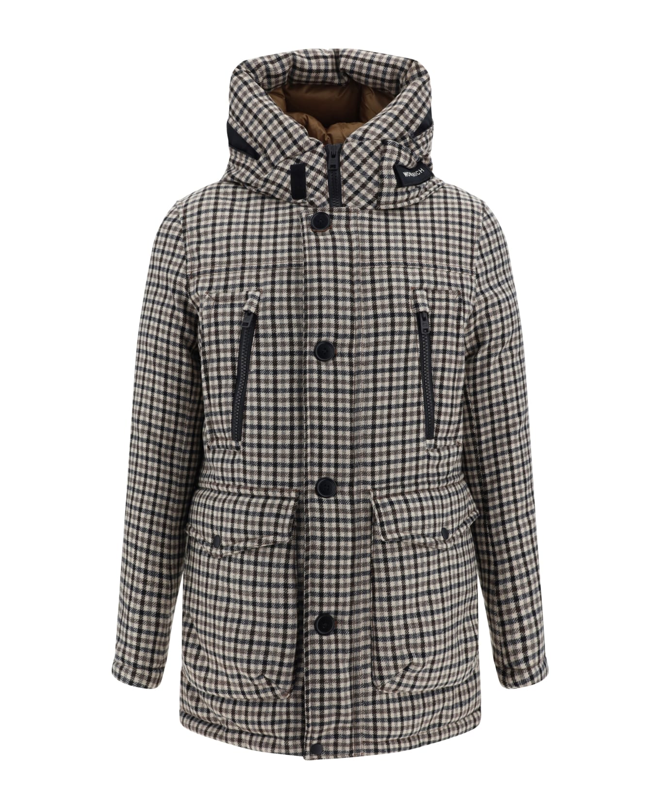 Wool arctic down jacket by woolrich, high-necked hooded design, front button and concealed zipper closure, padded and quilted design, multicolored plaid pattern, two large patch flap pockets on front, elastic cuffs, patch with iconic brand monogram applied on front, two sonic zipper pockets on front, regular fit.