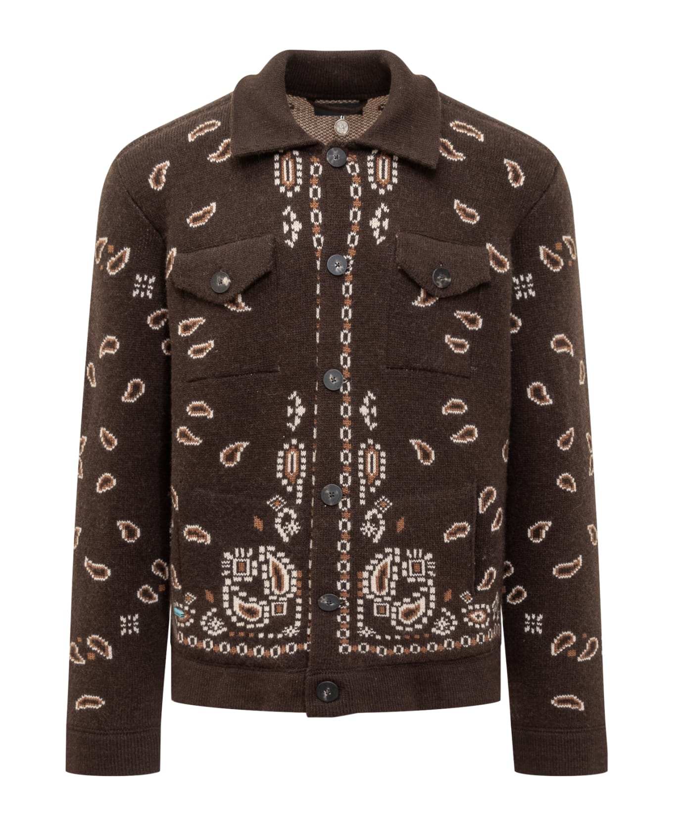 Brown wool blend jacket. All-over bandana pattern. Ribbed collar, cuffs and hem. Button closure. Chest pockets with flap closure with button. Composition: 82% Virgin Wool, 18% Cashmere