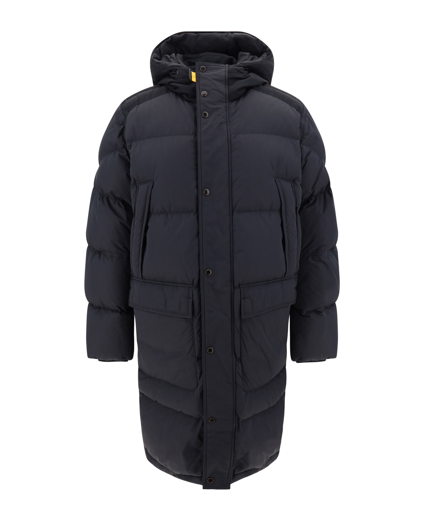 Bear down jacket by parajumpers, high-necked design with drawstring-adjustable hood, button and concealed zipper front closure, padded and quilted design, two welt pockets with snap-button closure applied on the front, foot-length model, elastic ribbed cuffs, two maxi flap pockets with closure applied on the front, two side zipper slits, monochrome pattern, patch with iconic brand logo applied on the left sleeve, regular fit.