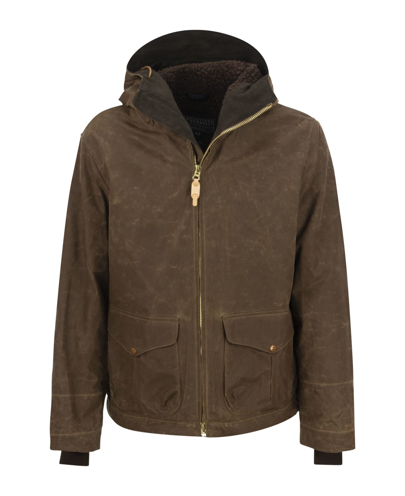 It is a particularly suitable garment for scooter riders who lead dynamic lives; made of water-repellent paraffinised cotton, it is an excellent protection from the rain. The hood has two drawstrings, one at the front, with a natural leather drawstring stopper, which allows it to be adapted to the shape of the face, and one at the back, which facilitates lateral vision when the hood is worn. At the bottom there are two large pockets with double openings, one on the side that serves as a hand warmer and one on the front with a closing flap and press stud. The buttons have leather reinforcement discs. A central inner flap under the zip fastening serves as windproof protection when the garment is closed; the zip is double-slider. At the bottom of the garment, there is a drawstring on the inside which allows the garment to fit snugly around the pelvis. - Elastic cuffs that do not allow air to enter - The inner lining is made of soft, warm fleece - It has a large inner pocket with a security zip DESIGNER ID: 7066-WX DARK TAN