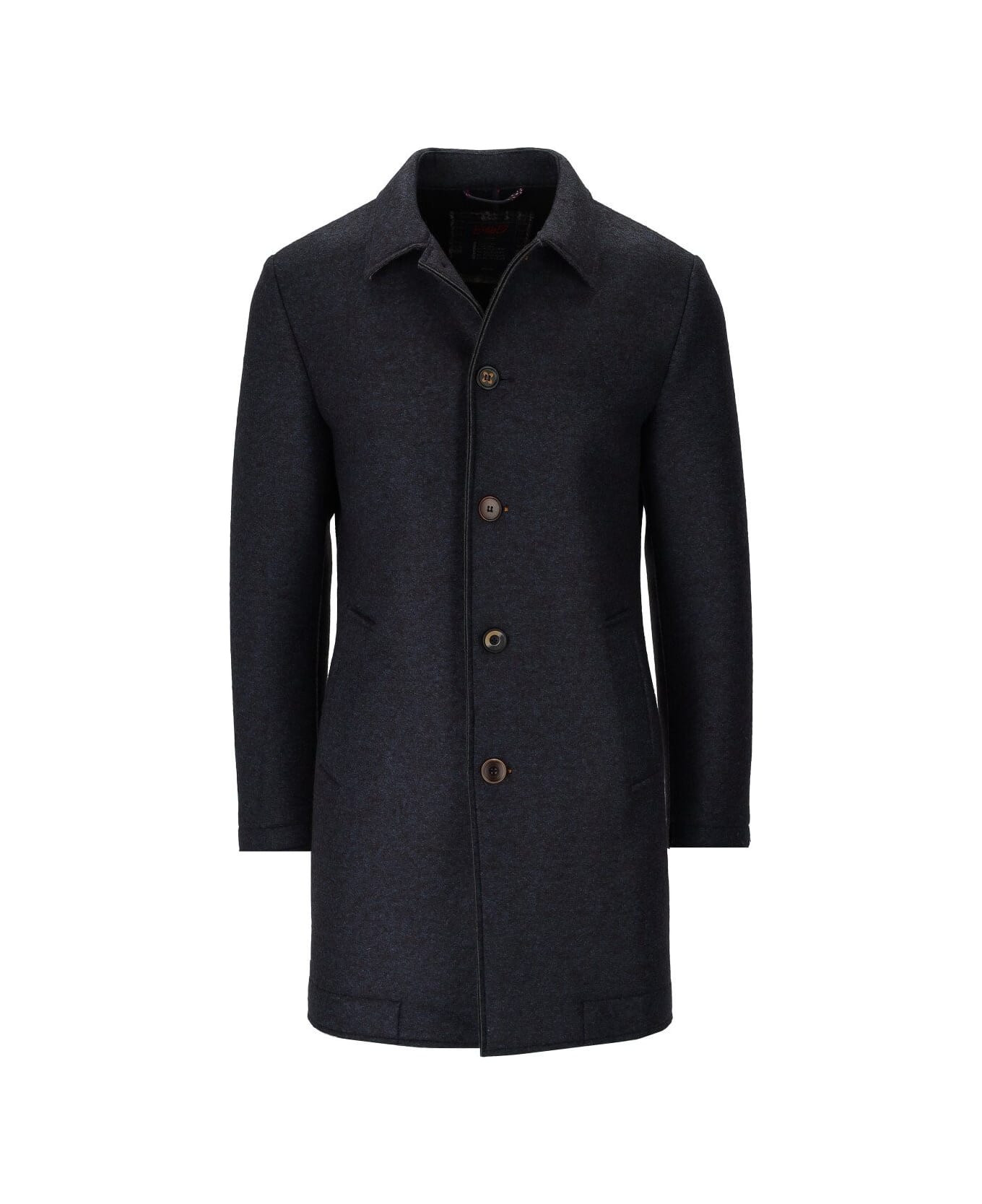 Colin coat by Bob made of blue mélange wool blend cloth, with welt pockets on the front, lined sleeves and slit on the back. Button closure. This item fits small. We recommend purchasing one size up compared to your usual one.