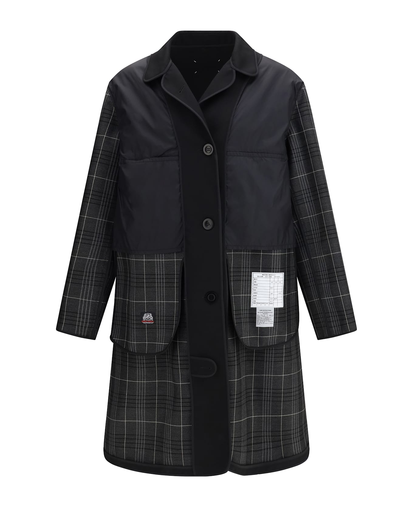 The buttoned coat by maison margiela conveys an essential and conceptual aesthetic, true to the maison s distinctive design language. the construction features a clean silhouette with a round collar and long sleeves, designed to create a balanced and understated shape. the front button fastening and side pockets add functional clarity, while the straight hem reinforces the minimalist approach. a coat that reflects contemporary wardrobe dressing through restraint and refined simplicity.