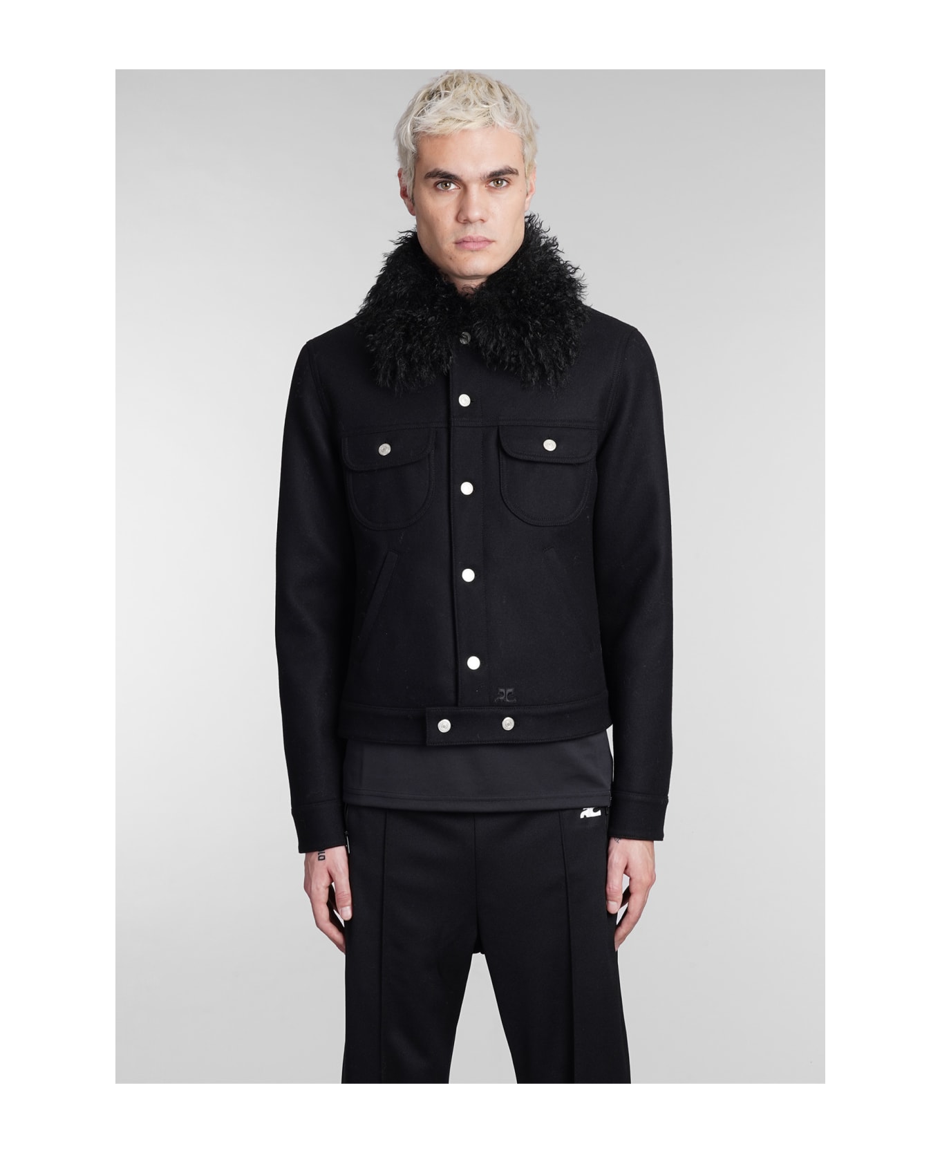 Coat in black wool, faux fur collar , Detachable Bib, flap pockets, pockets on side, frontal buttoning, long sleeves, 48% wool, 20% Poliurethane, 20% polyester, 12% polyamide, Made in Slovakia, Model is 1. 83 and wears size M
