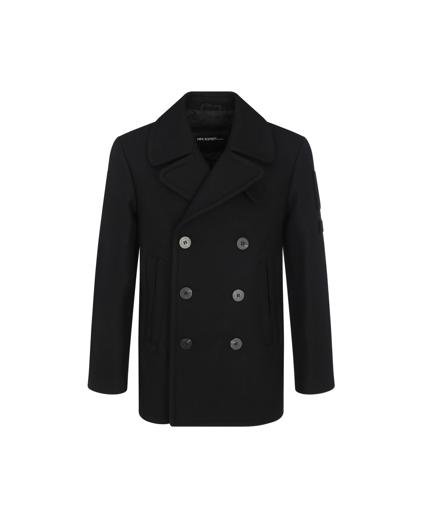 Wool coat by neil barrett, classic lapels, double-breasted front button closure, two welt pockets on front, adjustable cuffs with buttons, back slit, zipper pocket inside.