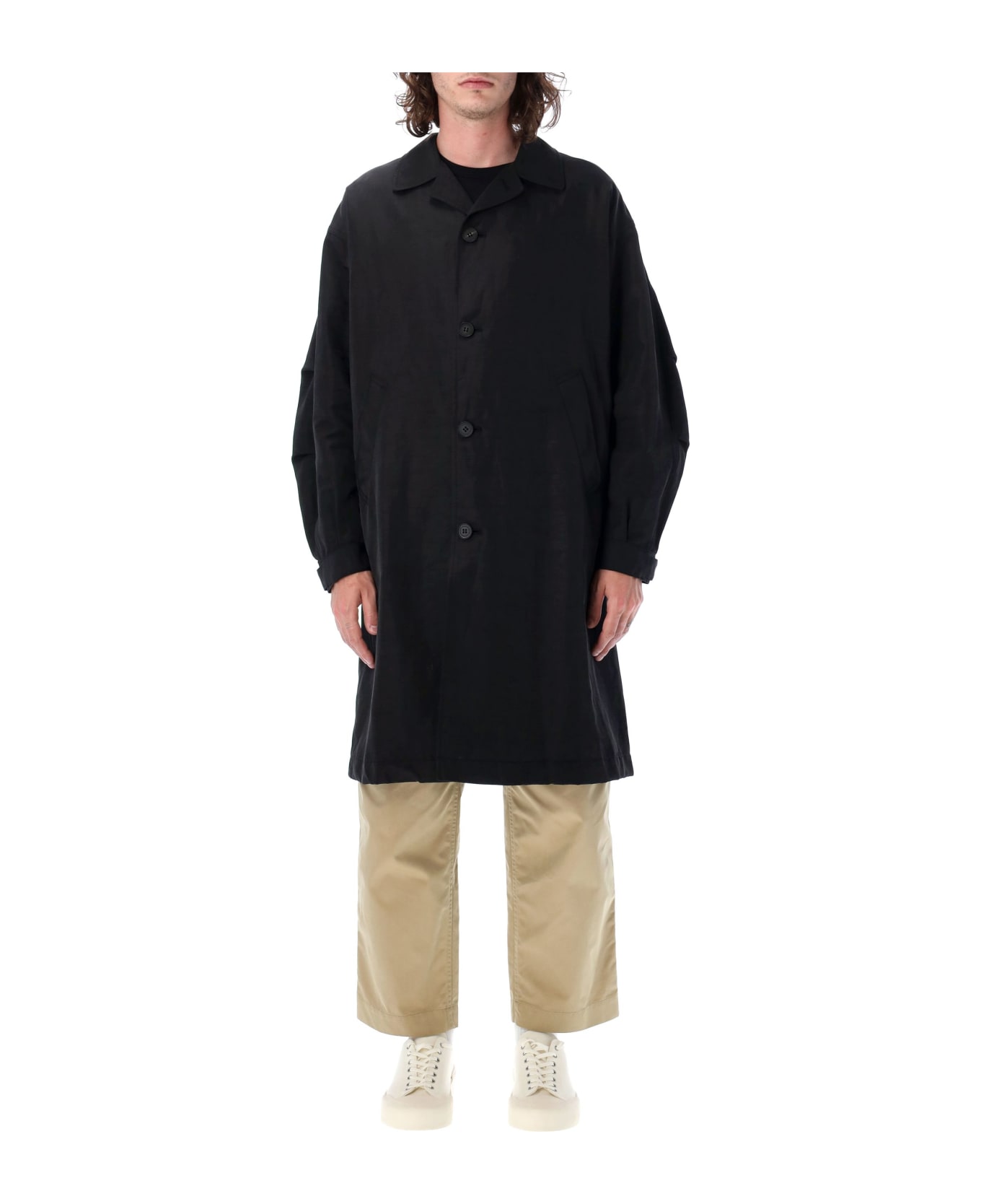 Linen And Nylon Coat By Comme Des Garçons Homme. Featuring: Spread Collar Single-breast Button Fastening Long Sleeves Buttoned Cuffs Partially Lined Hand Pockets Back Storm Flap The Model Is 190 Cm Tall And He Is Wearing Size M