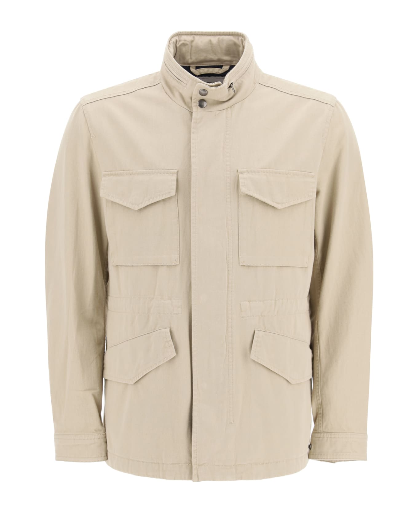 Woolrich field jacket inspired by the classic M-65 style, made from pure cotton with multiple flap pockets and foldable hood inside the raised collar with zip. Front closure with two-way zip and concealed snap buttons, internal drawstring at the waist with metal stopper. Partially lined in contrasting nylon. Slim fit, Buffalo Check Logo tag on the side. The model is 187 cm tall and wears a size L.