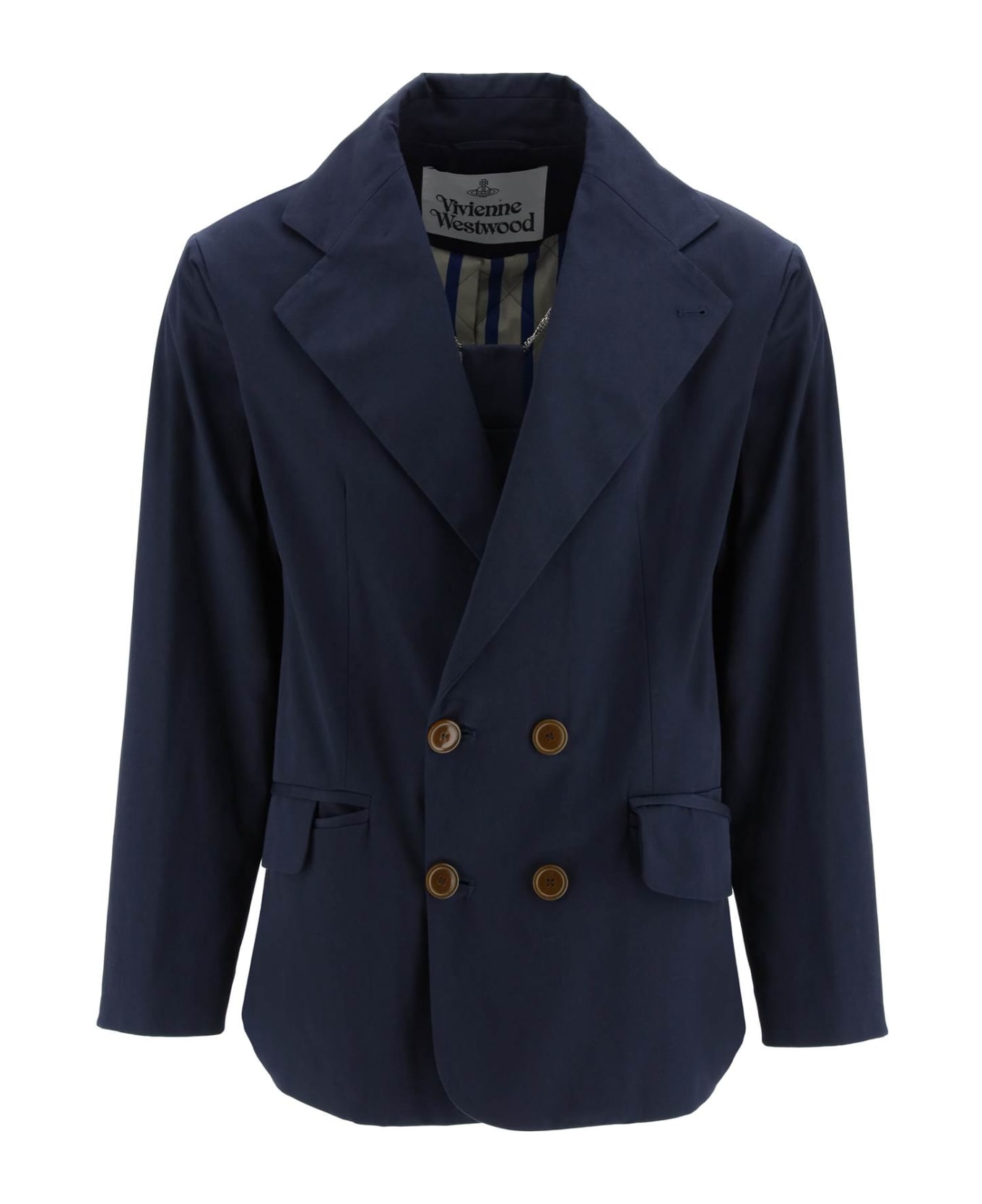 Vivienne Westwood oversized cotton twill caban, featuring a lapel neckline, and four-button closure and cuffs. Double back slit and quilted lining, provided with open side flap pockets. The model is 187 cm tall and wears a size IT 48. Composition: 100% CO