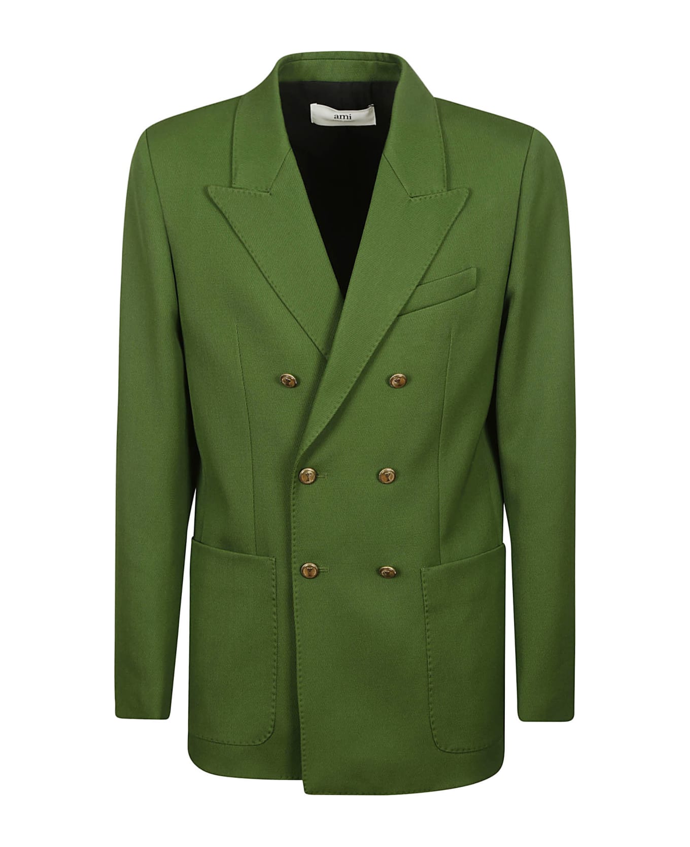 AMI Green wool jacket, double-breasted closure, peak lapels, golden buttons, patch pockets, breast pocket, buttoned cuffs, central vent on the back.