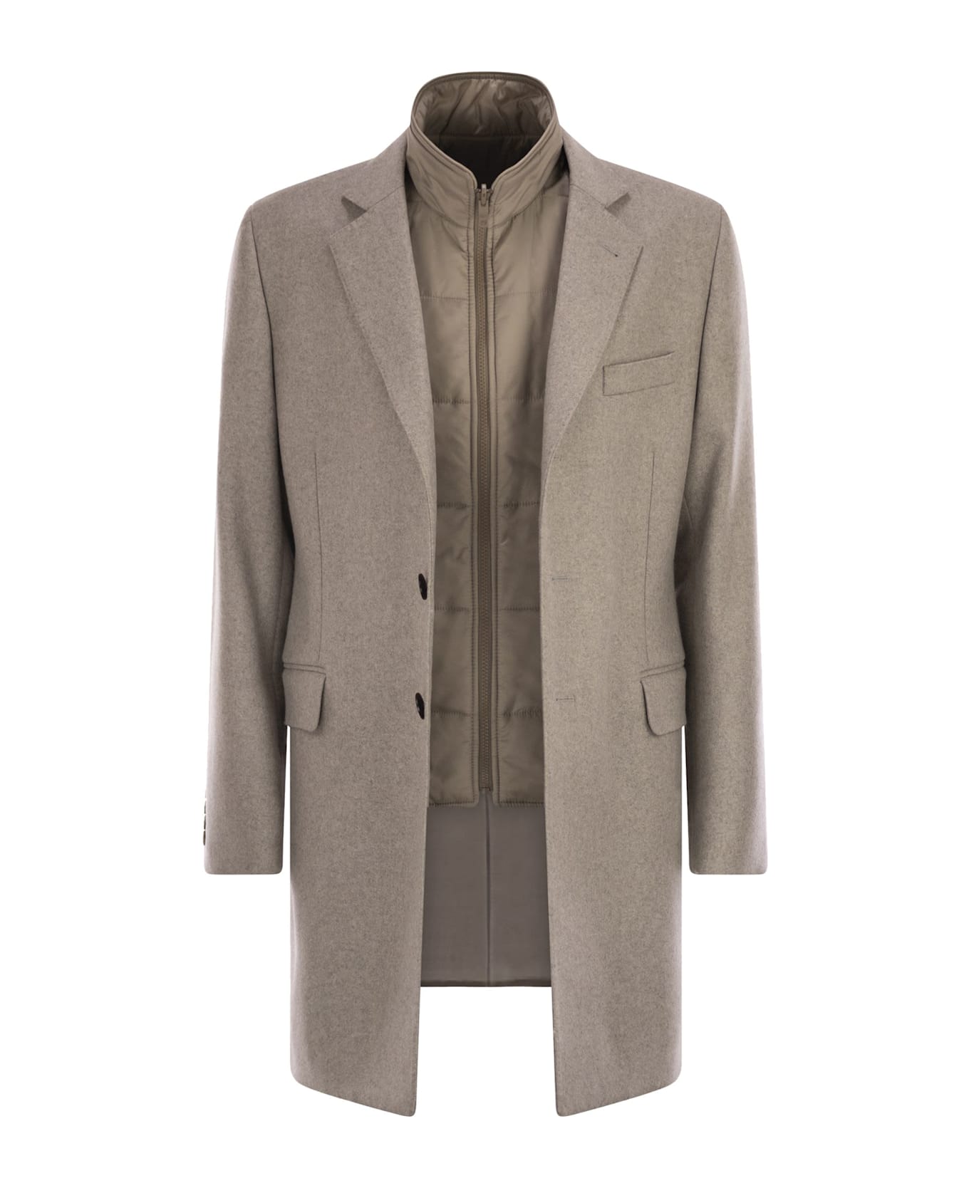 A meeting point between sartorial elegance and urban functionality, the iconic Double Coat redefines the canons of classic style by introducing the seasonless concept of 3-in-1 layering to the formal wardrobe. With three buttons, it is made of wool and cashmere blend cloth and features a pocket square, flap pockets and a back vent. The removable inner waistcoat, padded with ultra-light technical wadding, can also be worn separately. A double inner pocket completes the garment. - Removable inner waistcoat - Waistcoat zip fastening - Coat button fastening DESIGNER ID: NAM53511390GAHC205