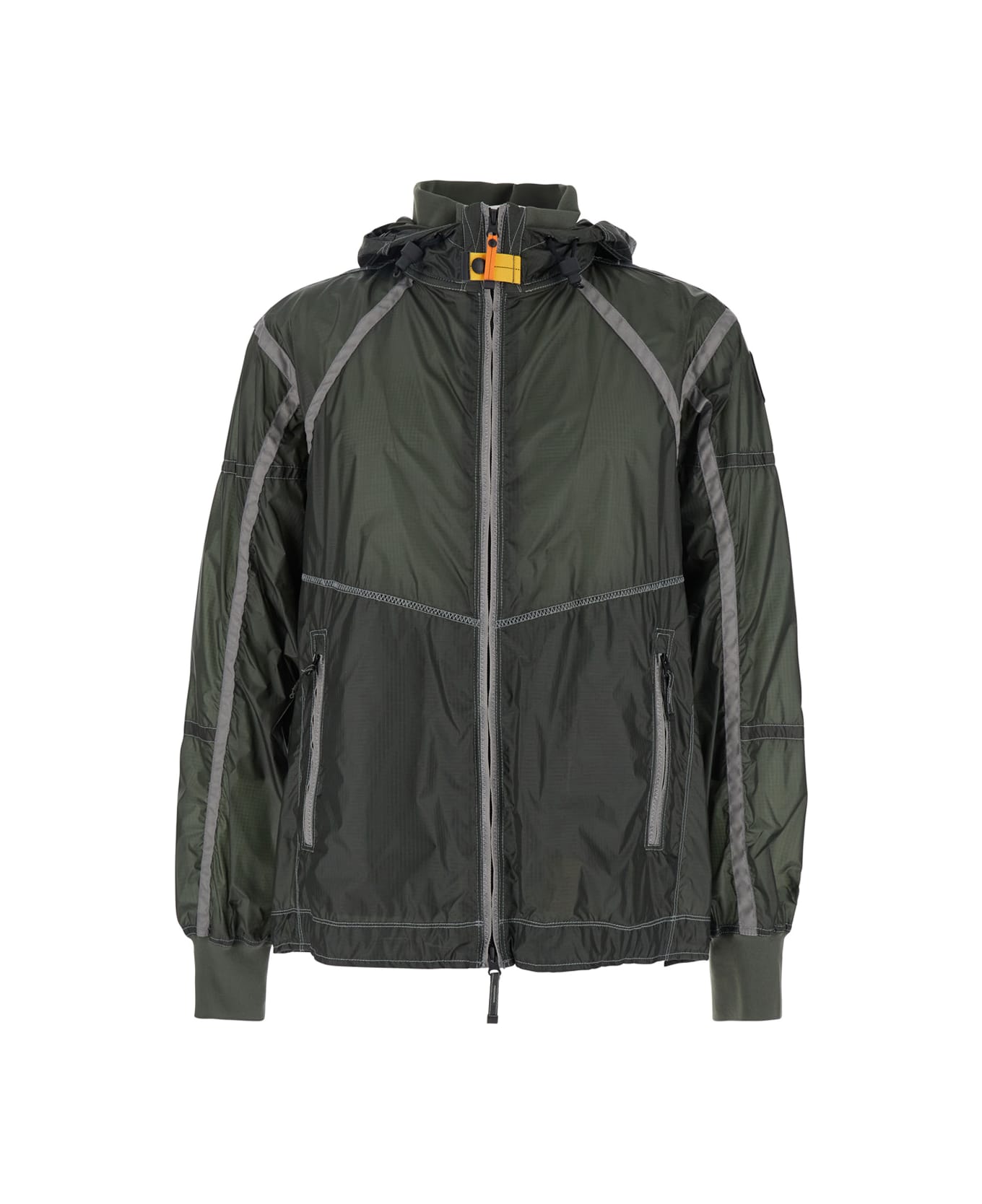Jacket Green Drawstring hood High collar Long sleeves Dropped shoulders Zip front closure Two zip pockets on the front Logo patch on the sleeve Shoulder straps on the back Elasticized cuffs Drawstring hem Tech fabric Regular fit