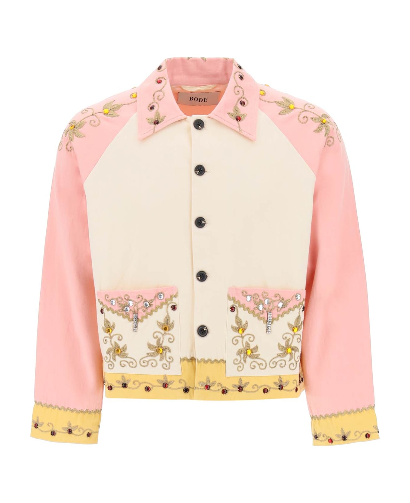 Inspired to vintage clutch bags, this Bode's short jacket is made from colorblocked cotton embellished with lurex embroideries and colorful crystals. Button-up style designed with raglan sleeves, shirt collar, and two patch pokets at the lower front. Full lining. The model is 187 cm tall and wears a size M/L.