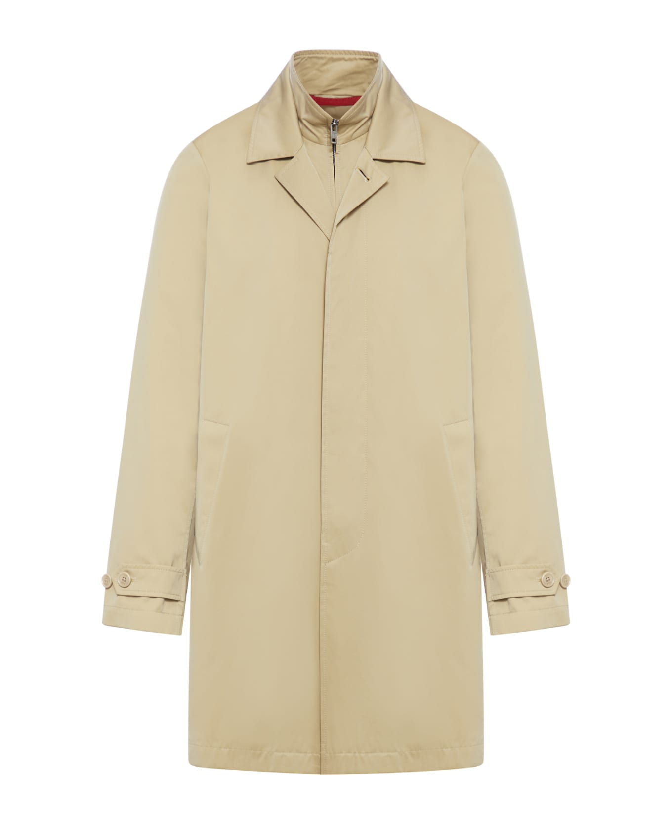 - layered design - high neck - notched lapels - long sleeves - belted cuffs - two side slit pockets - thigh-length - straight hem - full lining - concealed front button fastening - concealed front zip fastening