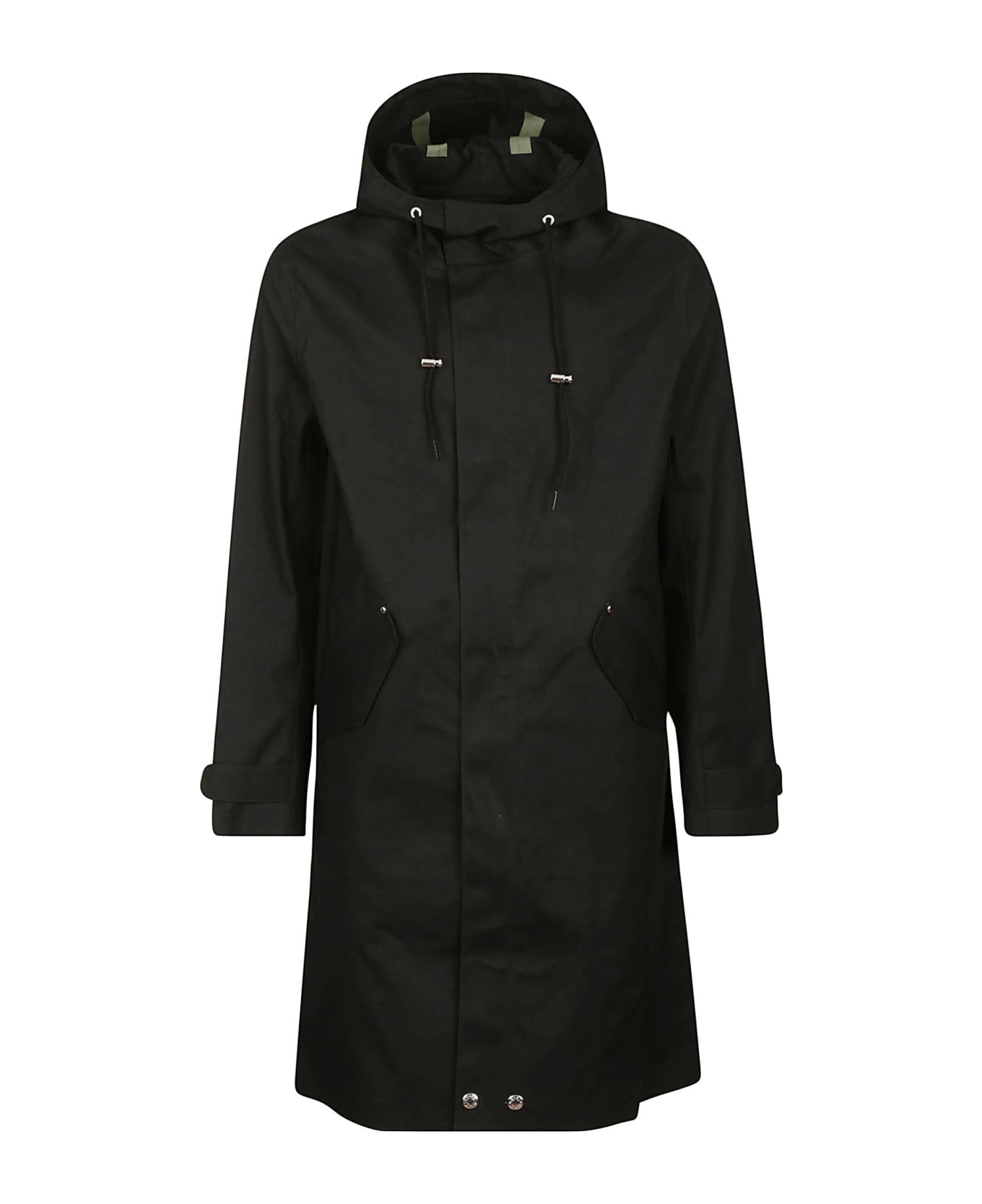 Mackintosh Parka in black cotton, hood with drawstring, zip and buttons closure, side welt pockets, back slit, adjustable cuffs. Composition: 100% Cotton