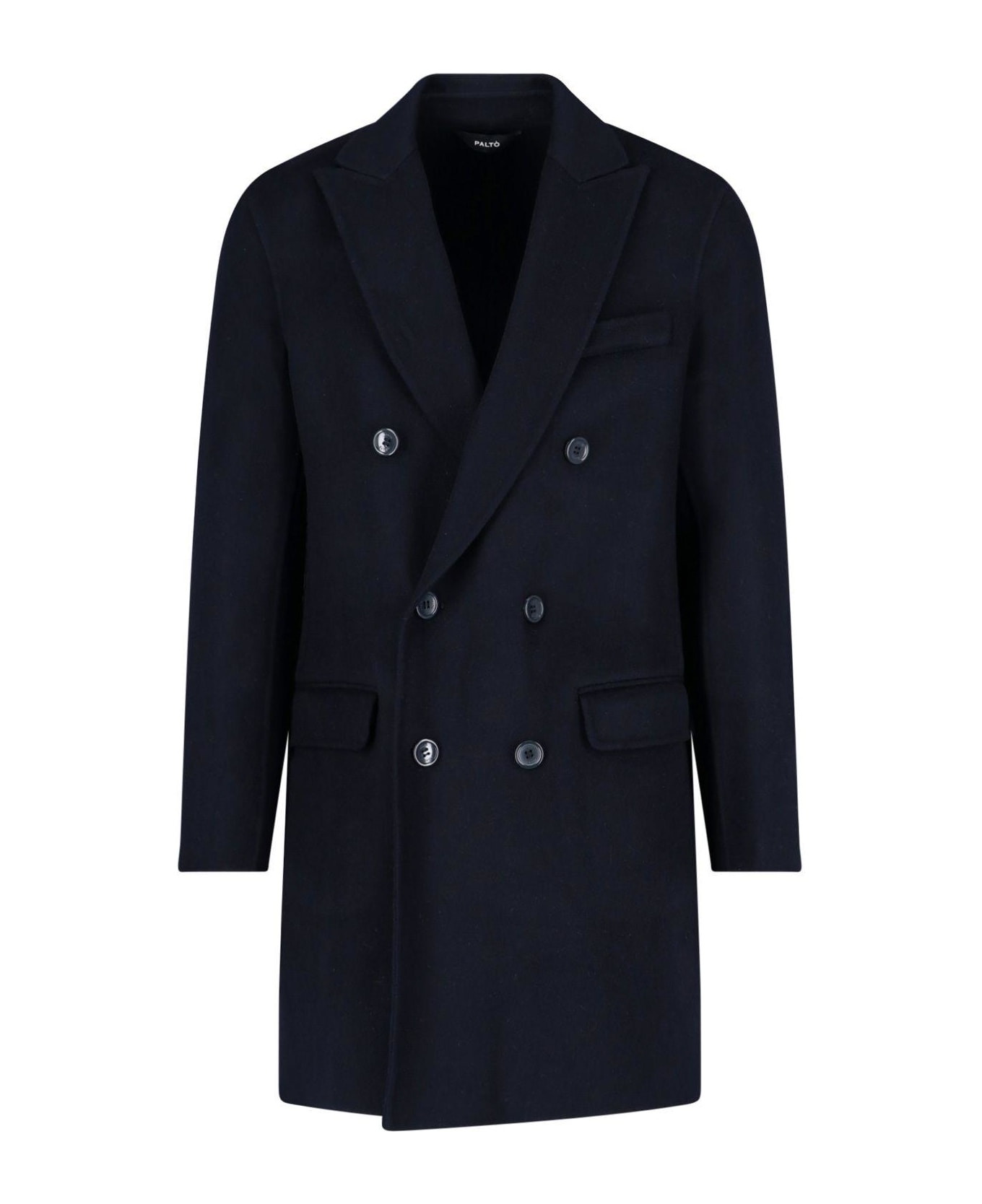 Paltò 'Gregorio DB' Coat, wool blend, blue, classic lapels, double-breasted closure, chest pocket, two front bellows pockets, buttoned cuffs, medium length, rear central slit.