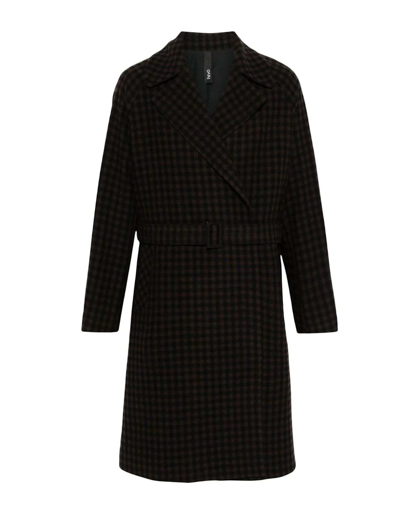 Brown and black wool blend Brindisi coat, interlock twill weave, brushed effect, check pattern, double-breasted button fastening, wide notch lapels, long raglan sleeves, two side welt pockets, central rear vent, internal zip-fastening pocket, full lining, straight hem, mid-length