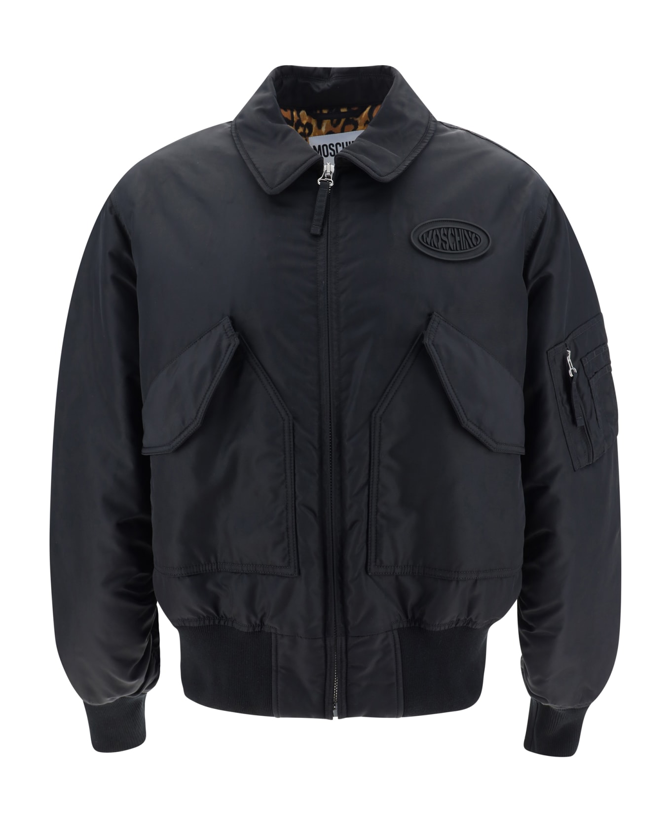 Jacket by moschino, classic collar, front zip fastening, two large front pockets, ribbed hem, lined interior with leopard pattern, ribbed cuffs, embossed iconic brand monogram, one zipped patch pocket on left sleeve.