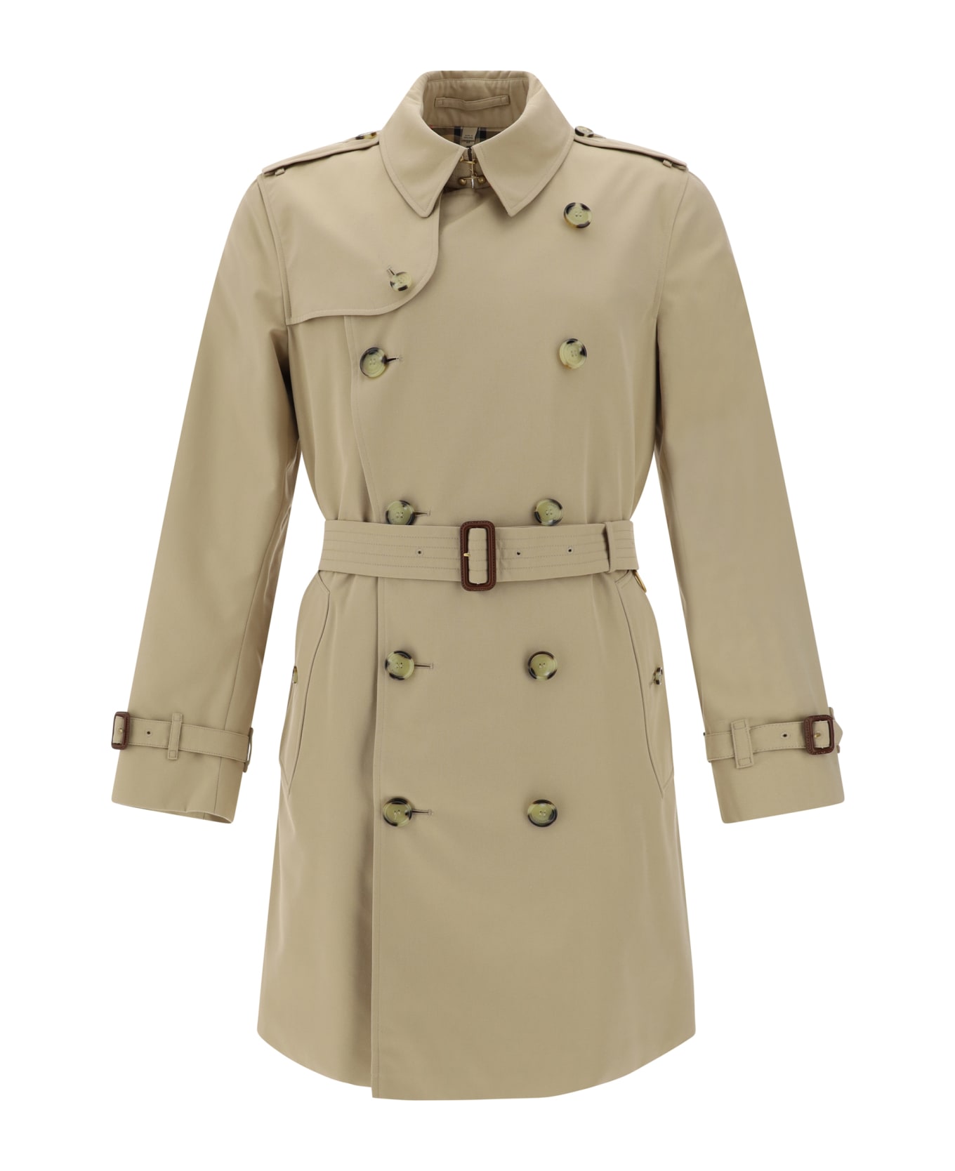 Cotton kensington coat by burberry featuring a classic collar, a double-breasted front button closure, two welt pockets on the front, an adjustable waistband using a removable matching belt, a back slit, a monochrome pattern, and a regular fit.