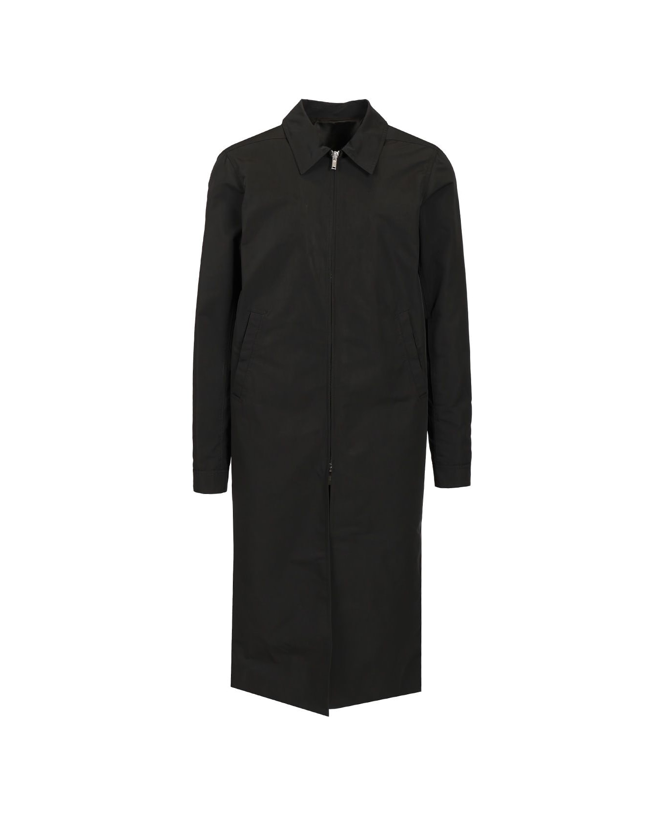 Lightweight coat by Rick Owens in black tech faille featuring a loose fit, center front zipper closure and a classic collar