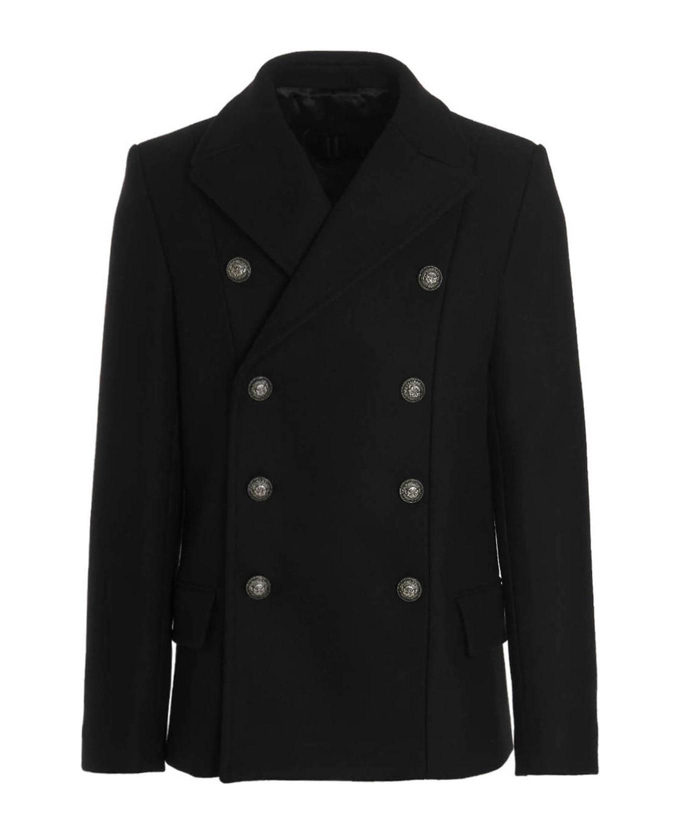 Wool double breast coat featuring a logo button fastening, pockets, long sleeves, and structured shoulders.