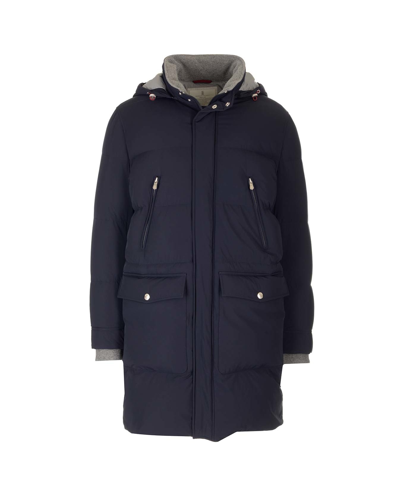 Long down jacket in water-repellent blue quilted nylon by Brunello Cucinelli. High quality padding combined with a collar with ribbed knit inserts and a removable, lined and adjustable hood with drawstring. Regular fit, double zip and button closure. Two internal pockets with button and a pen holder. High pockets with zip, ribbed knit cuffs and bottom.