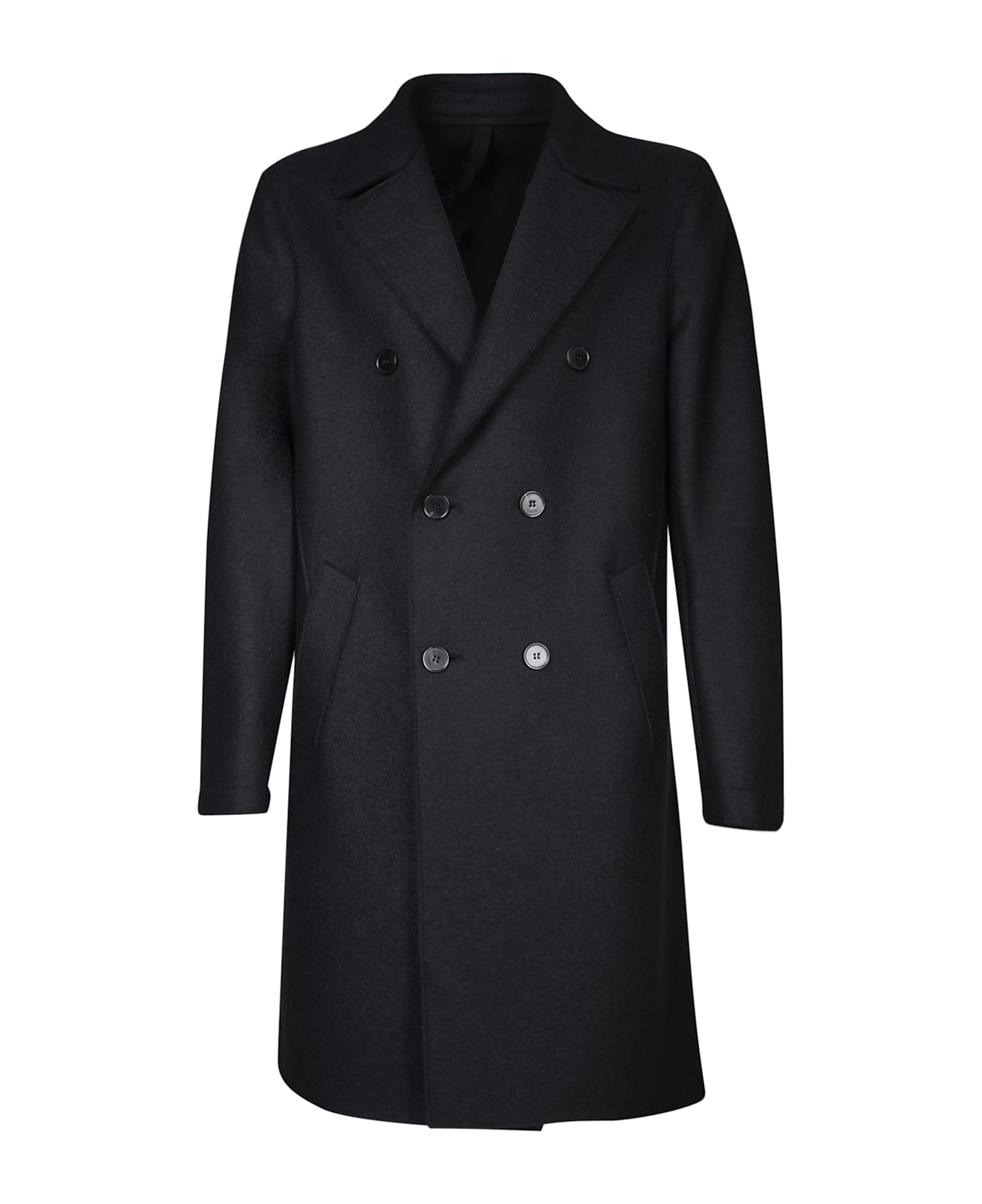 Designed by Harris Wharf London, this black wool oversized coat exemplifies understated elegance with a double-breasted closure featuring distinctive buttons and a modern, broad cut.