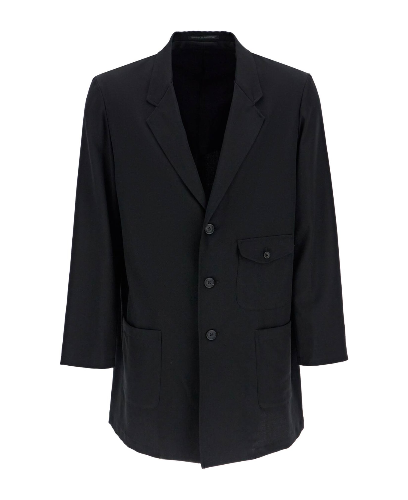 Deconstructed wool twill blazer by Yohji Yamamoto, cut to an oversized fit. Designed with a single-breasted closure, it features three patch pockets and buttoned openings on the sleeves and sides. Unlined interior hosting three additional pockets. The model is 187 cm tall and wears a size M.