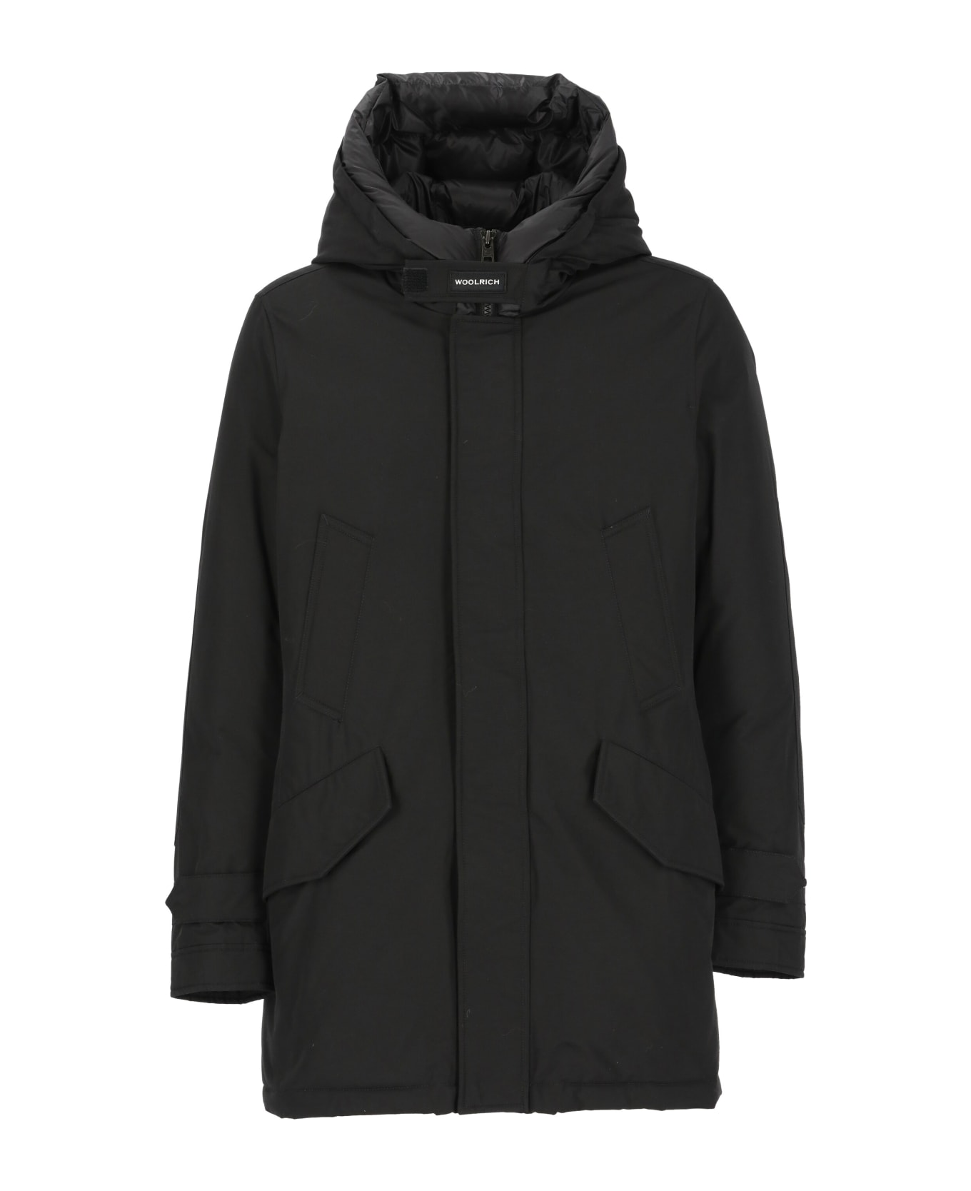 Polar Parka from Woolrich: - Black Woolrich cotton blend parka for man - Hood - Long sleeves - Two front slit pockets - Two front welt pockets with snap buttons - Front zip and buttons fastening