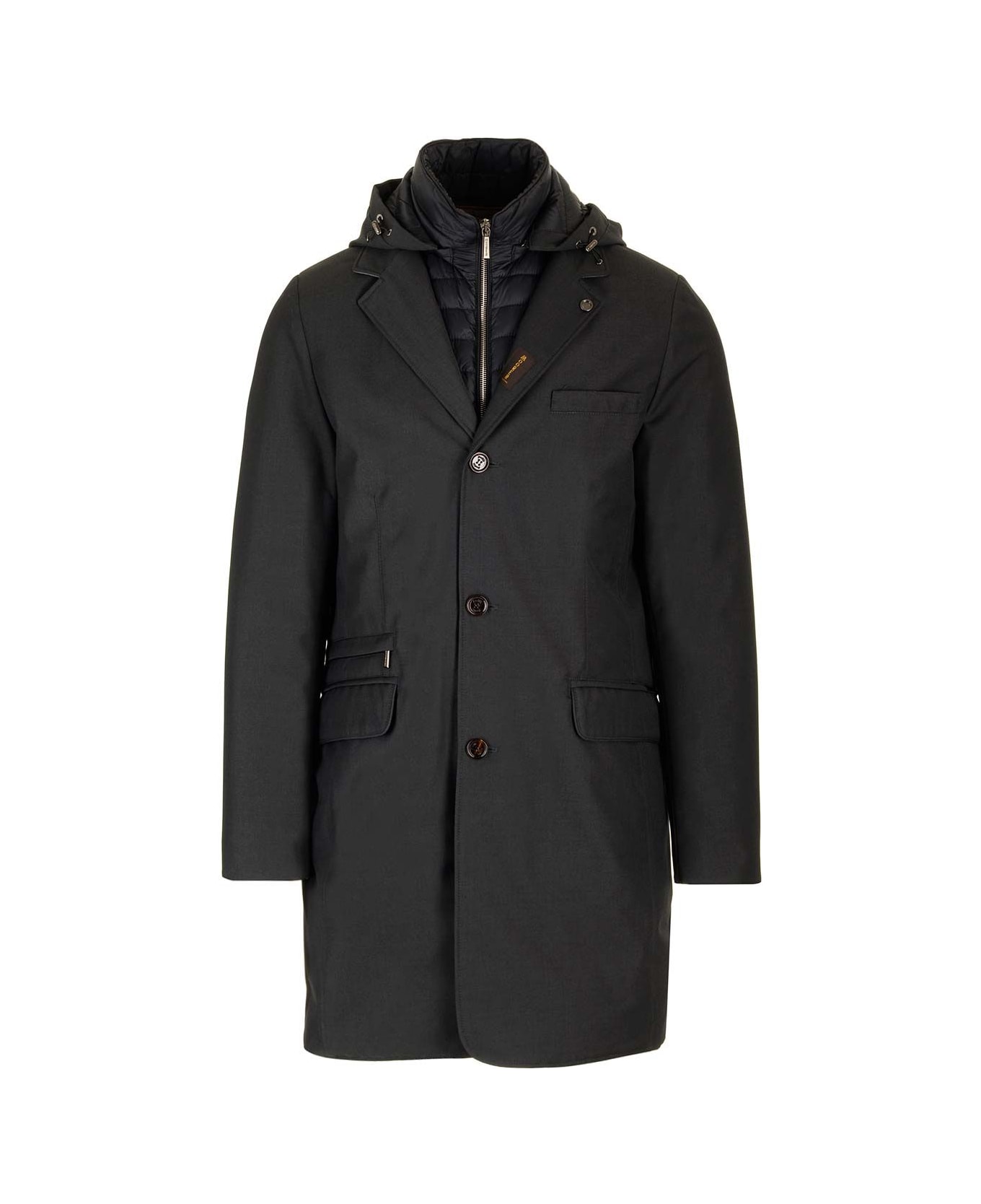 "Redon-PUM" coat in blue membraned technical flannel from Moorer, padded with goose down, with bodice and detachable padded hood, double front fastening with zip on the bodice and horn buttons, flap pockets at the waist, welt zip pocket on the front and internal pockets.