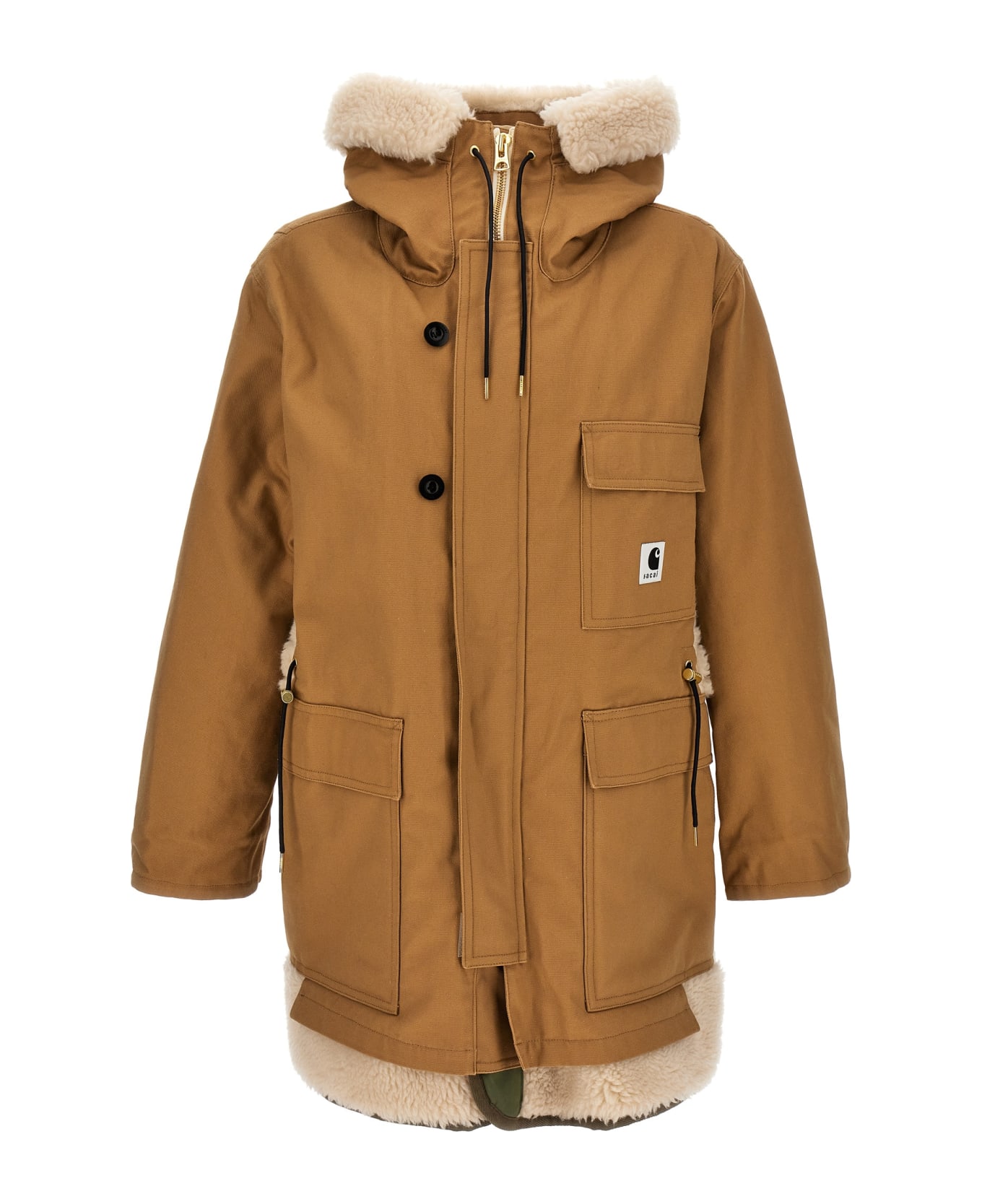 Sacai x Carhartt WIP canvas coat with faux fur inserts, hood, zip and button closure, pockets, side slits with buttons, long sleeves, and front logo patch. Composition: 100% cotton