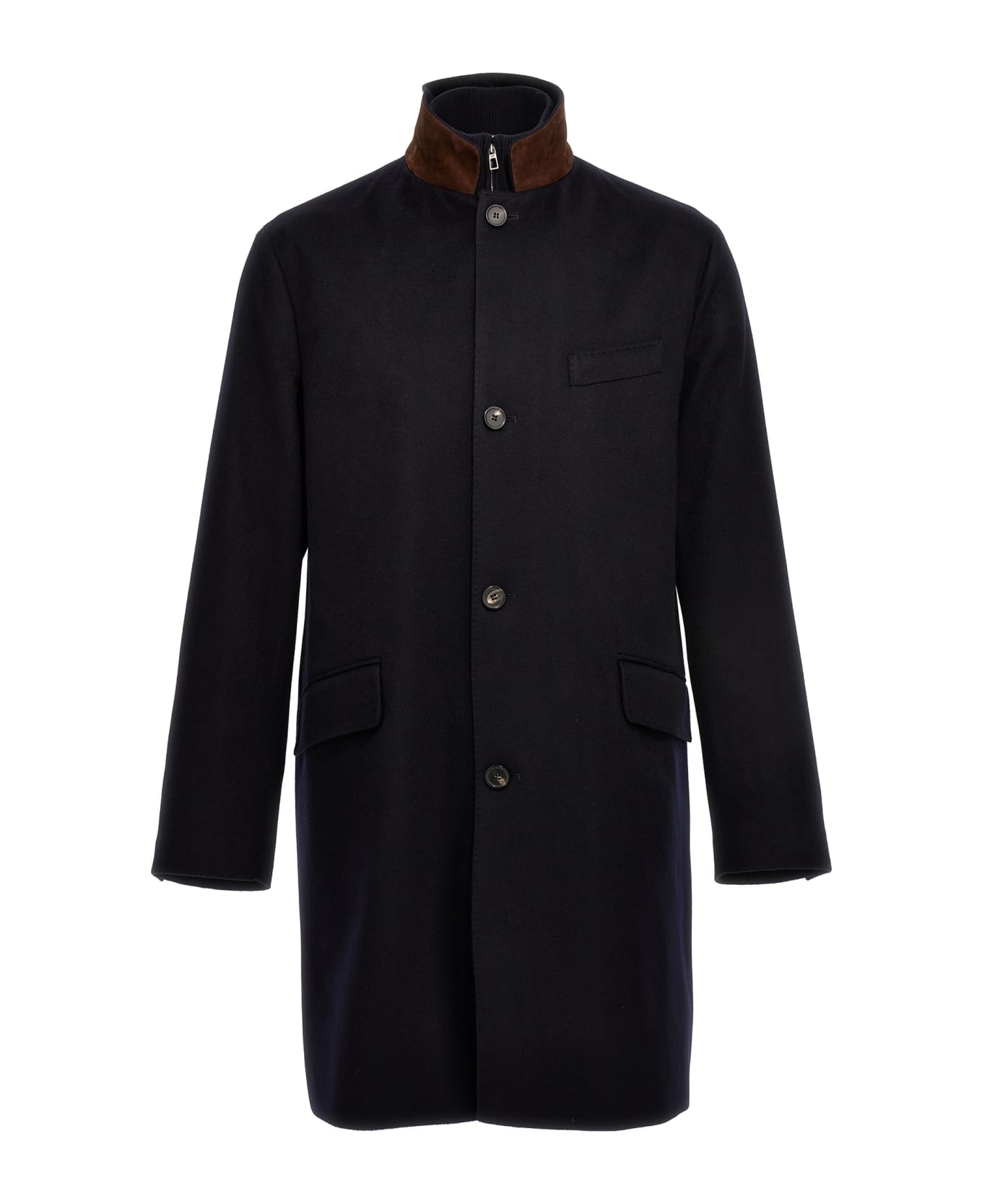 Single-breasted cashmere coat, button closure, removable harness detail with zip knit collar, pockets, long sleeves, suede detail, back split, martingale. Composition: 100% cashmere