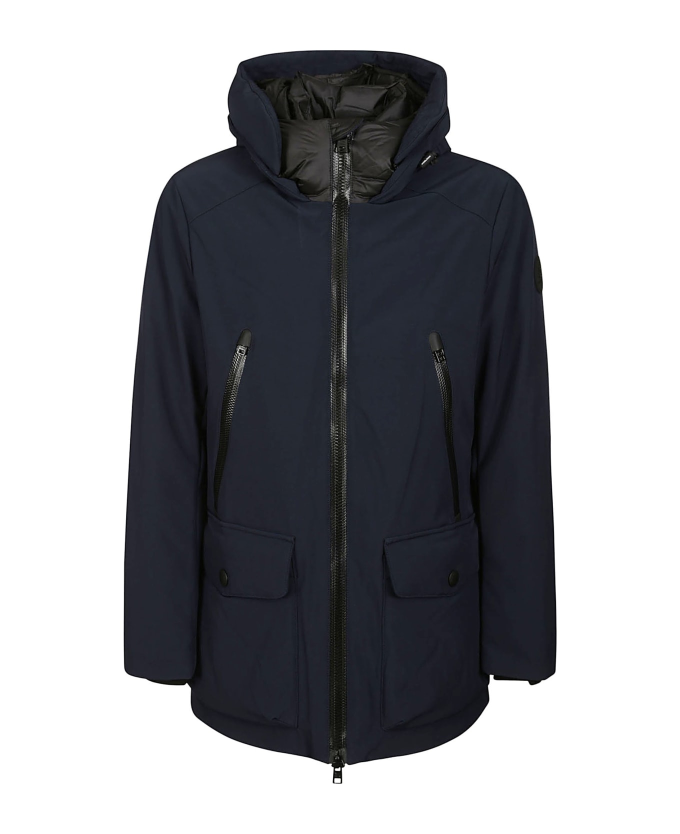 The WOOLRICH parka is made of a waterproof and windproof fabric. It is padded with duck down and horizontally quilted inside, and has a hood with a detachable insert with the embossed Woolrich logo and a two-way zip closure. It also features details that refer to the classic model: handwarmer pockets on the top, flap pockets on the bottom, and elasticized inner cuffs. Inside, it has a comfortable drawstring to adjust the fit and a mesh pocket with a snap button to keep items secure. Side slits with snap buttons allow it to be worn over bulky garments.
