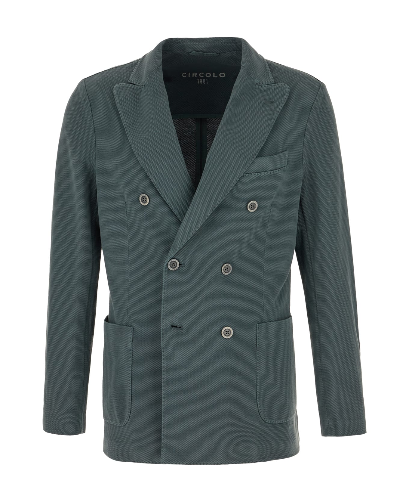 Blazer realized in cotton stretch characterized by notch lapels. -Double-breasted closure by three buttons -Two patch pockets and a chest pocket -Four buttons on the sleeves -Lateral slits on the hemline -Partially lined with a slit pocket