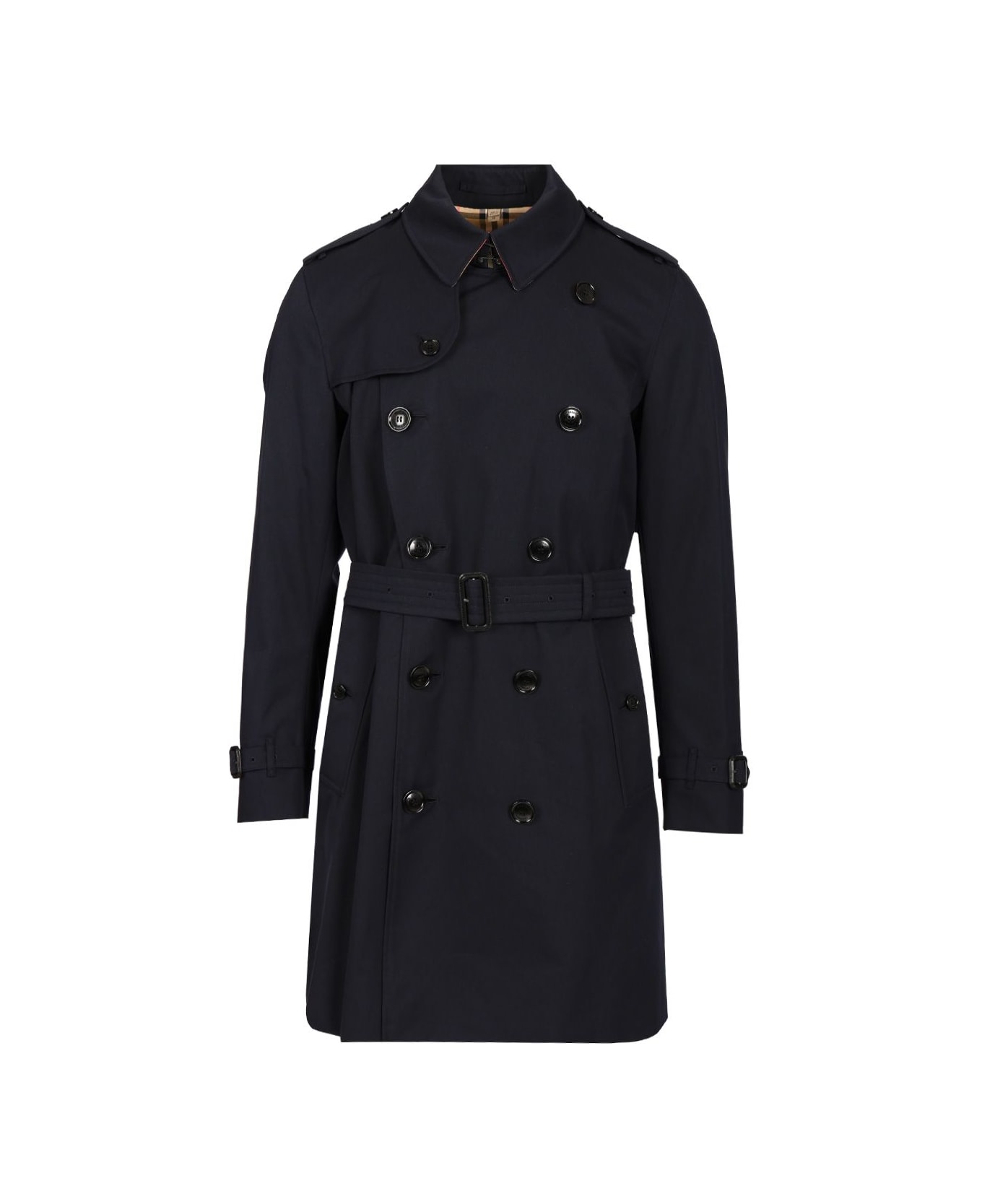 Burberry "The Kensington" medium trench coat in blue cotton, double-breasted fastening, buttoned welt pockets, narrow shoulders, tapered waist, hook-and-eye collar, storm flap, belted cuffs, D-ring belt, tartan undercollar, storm flap.
