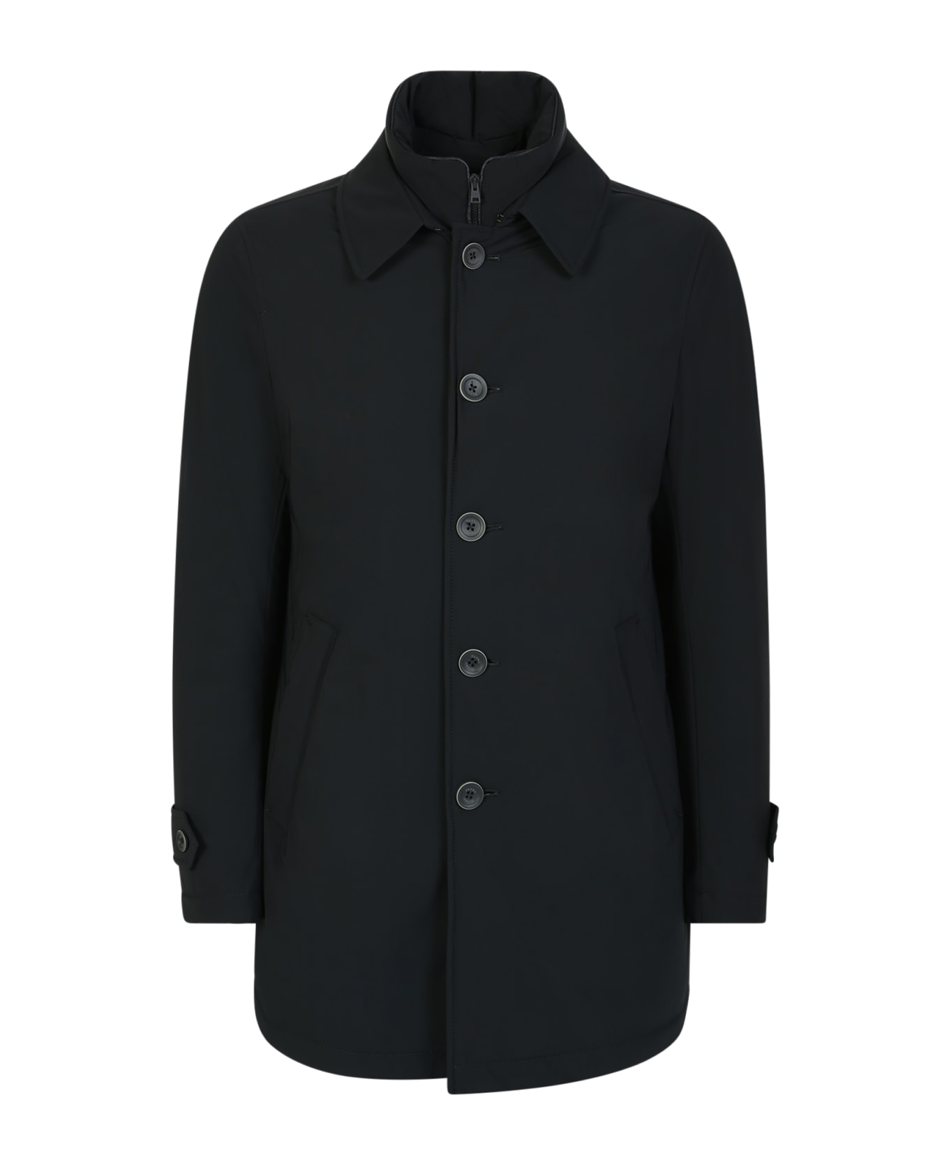 Classic collar. Long sleeves. Front button fastening. Concealed front zip fastening. Padded design. Two side slit pockets. Colore: dark navy