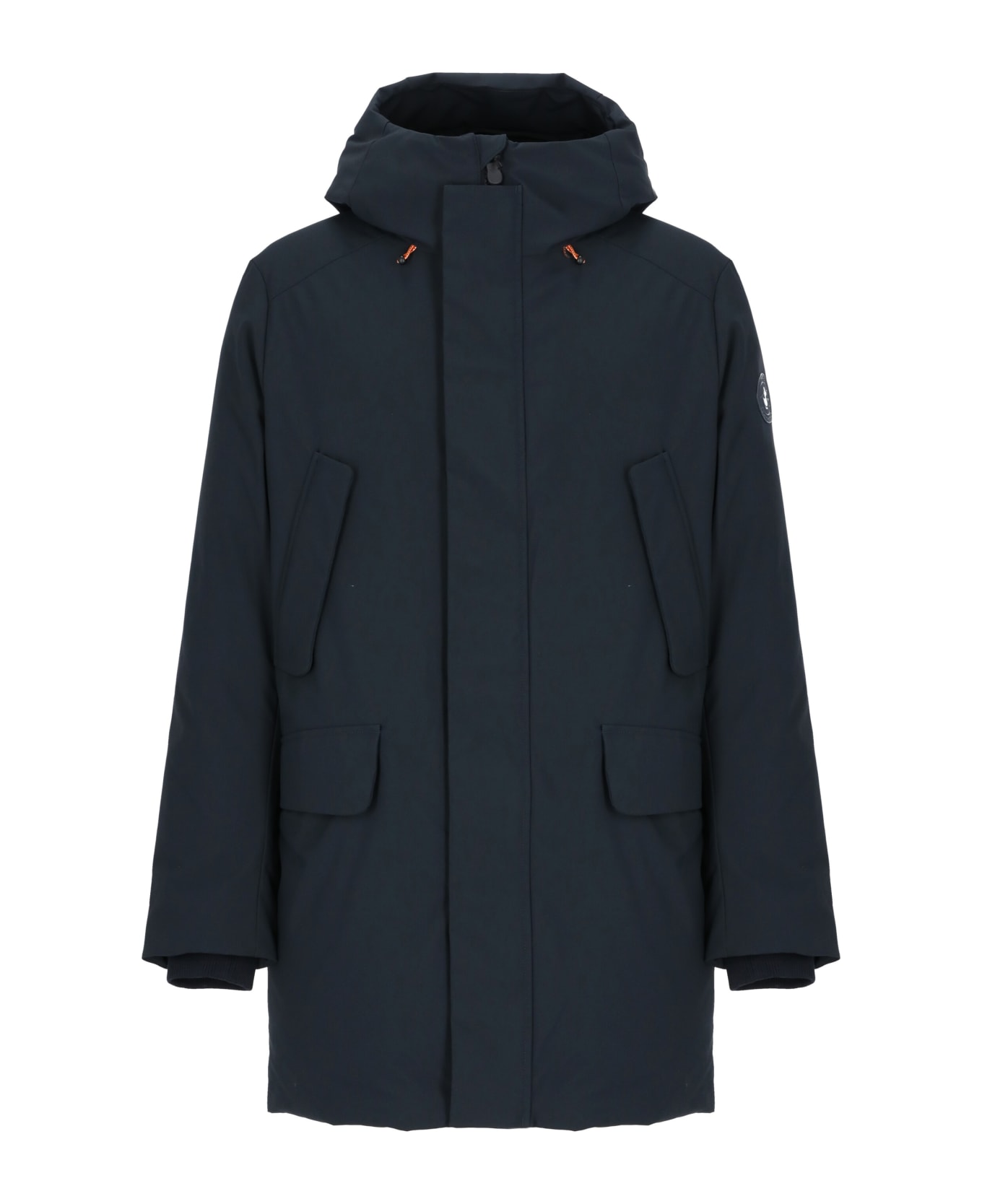 - Blue Save The Duck padded parka for man - Hood with drawstrings - Long sleeves - Tone on tone logoed patch at left sleeve - Four flap pockets with snap buttons - Front zip and snap buttons fastenig