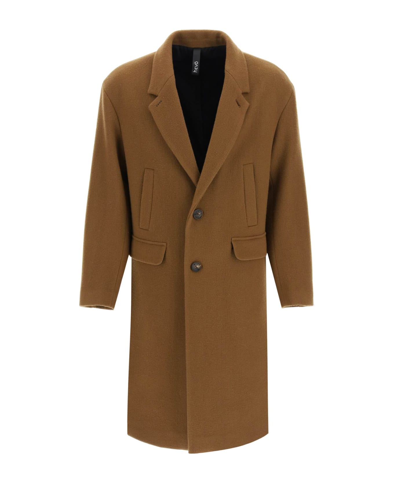 Hevò coat in wool-blend fabric, characterized by two-button single-breasted closure and narrow lapel collar enriched with the signature four metal points detail on the right side. Two front flap pockets and two vertical welt ones. Middle split on the back vent. Straight cut and slightly oversized fit with dropped shoulders. Lined. One inner zippered welt pocket. The model is 185 cm tall and wears a size IT 48.