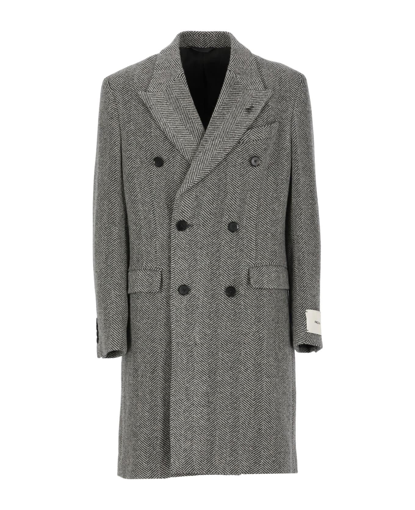 - Grey Paoloni wool coat for man - Peak lapel collar - Long sleeves with buttons at hem - Two front pockets with flap - One front welt pocket - One front pocket with flap and buttons - All-over herringbone pattern - Front buttons fastening - Rear vent at hem