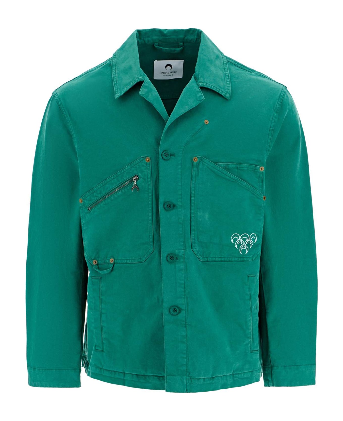 Marine Serre workwear inspired overshirt crafted in recycled cotton. It features notched lapel, front button closure, a zipper pocket and a patch pocket at chest, side welt pockets, back elasticated pockets and it's enriched by contrasting 'Olympic Moon' embroidery on the front and metal patch with logo on the upper-back. Regular fit with boxy cut. The model is 187 cm tall and wears size L.