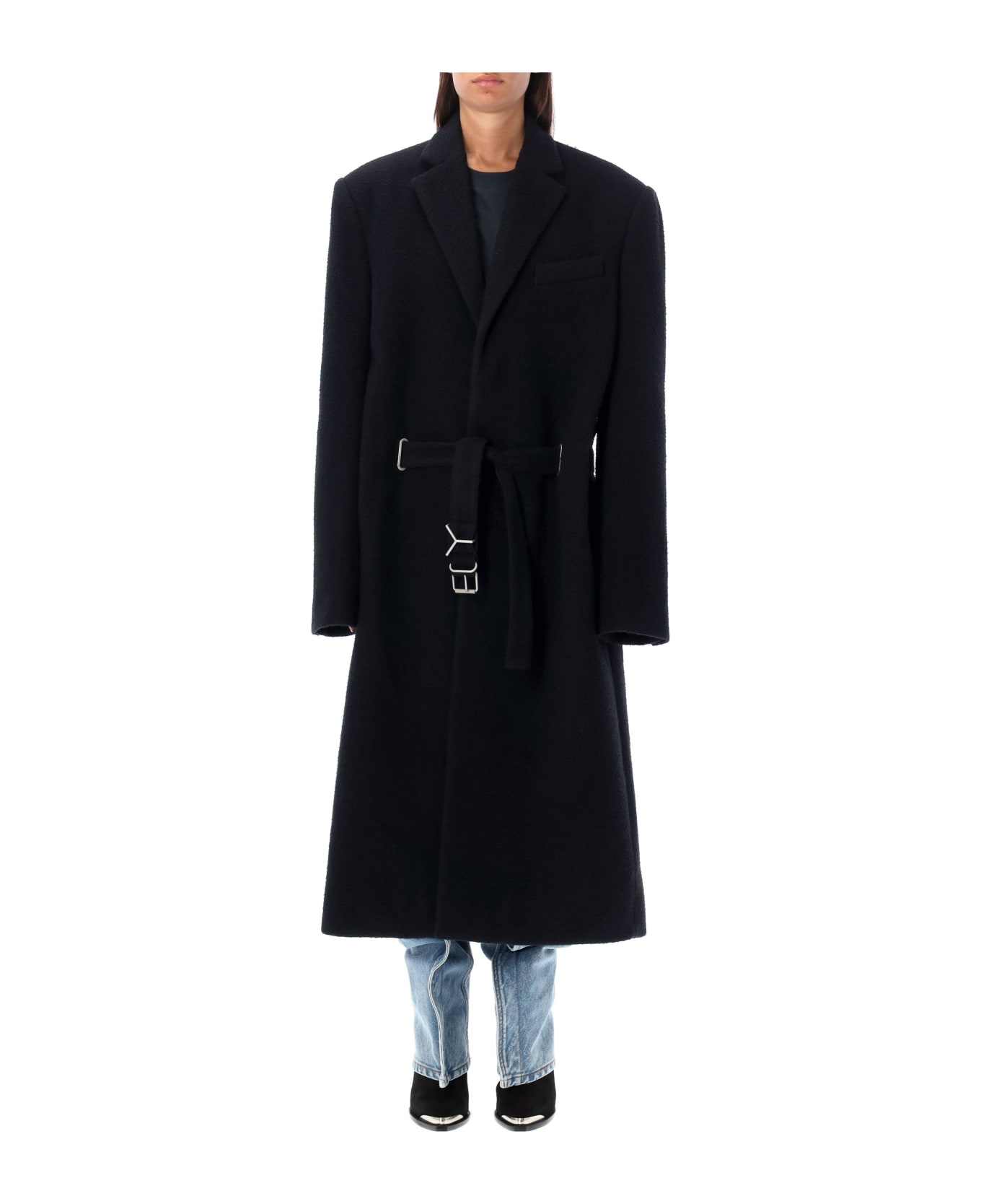 Y Belted Brushed Wool Coat By Y/project. Featuring: V-neck Long Sleeves Padded Shoulders Button Closure At Front Welt Pocket At Chest Lateral Pockets Adjustable Belt At Waist Buttoned Cuffs Rear Vent Inner Pocket Brushed Wool Model Is 1,72 M Tall And She Is Wearing Size S Model Is 1,90 M Tall And He Is Wearing Size M