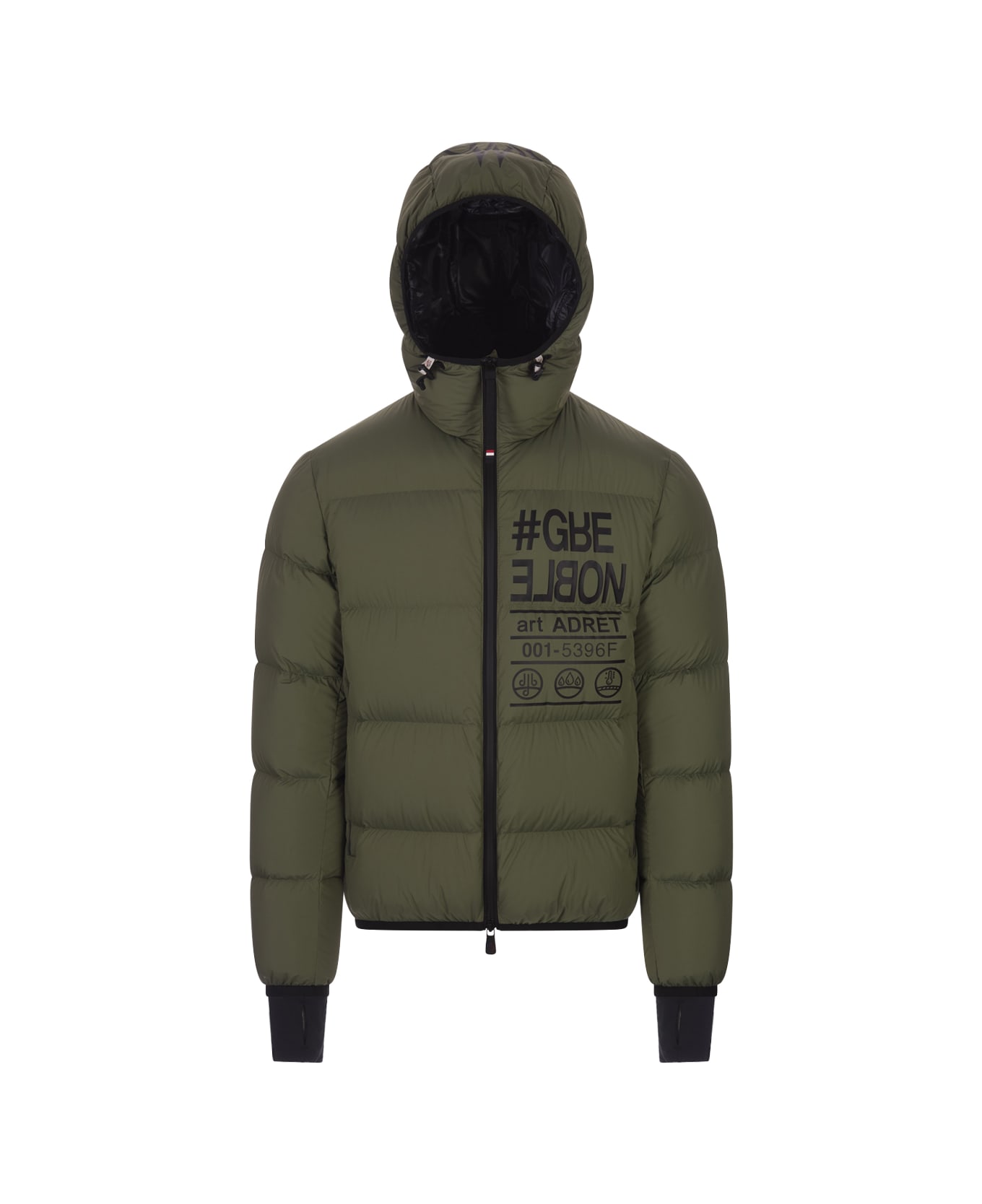 Adret short down jacket by Moncler Grenoble made of dark green technical nylon and featuring nylon lining, down padding, adjustable hood, logo and lettering details, stretch jersey cuffs, Water Repellent Look zip fastening, two Water Repellent Look zip pockets and an inside pocket for media devices. Regular fit. Straight cut.